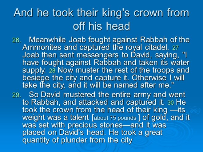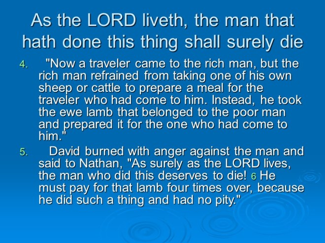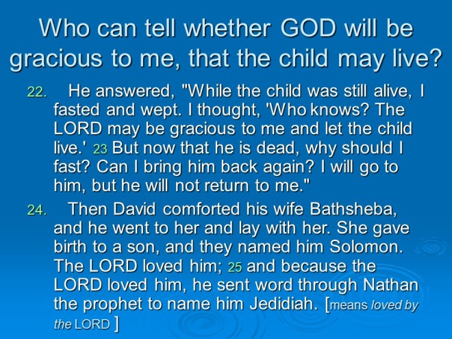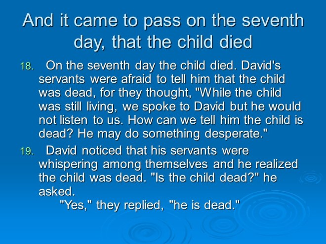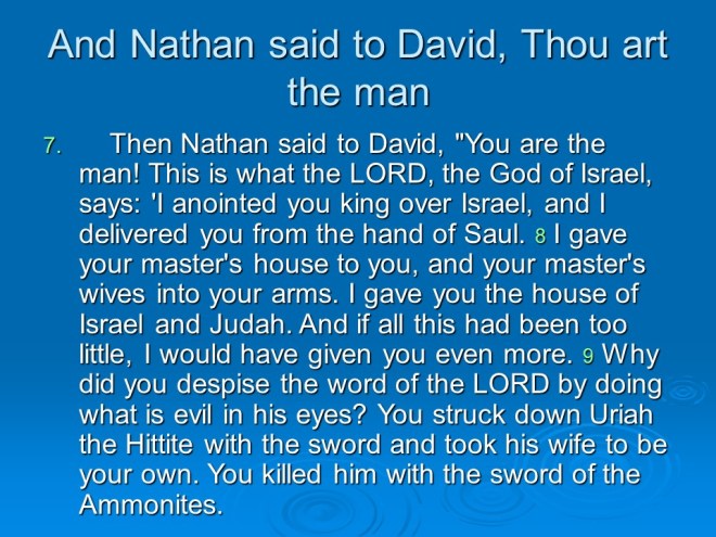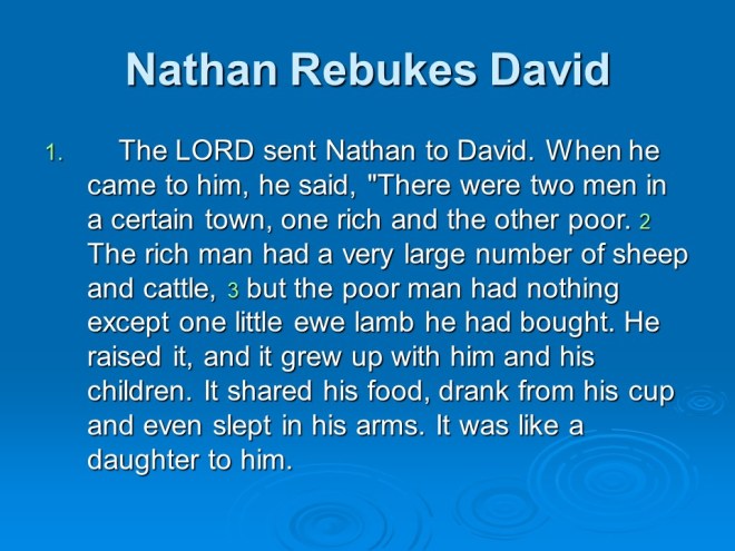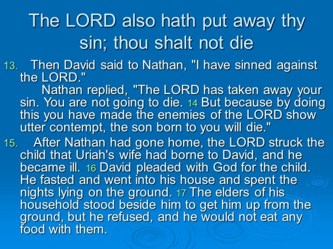 2 Samuel 12. Nathan confronted David about his sin and David Confessed: “I have sinned against the LORD.” It tells of the death of David’s son with Bathsheba, after which a second son, Solomon was born to Bathsheba. Finally, the chapter reverts back to war and David’s men captured Rabbah, a city of the Ammonites.