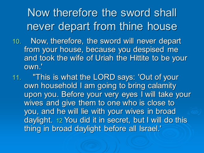 2 Samuel 13 describes the seedy story of Amnon and Tamar, all within David’s family. David’s son Absalom then killed Amnon, after which Absalom fled to Geshur.