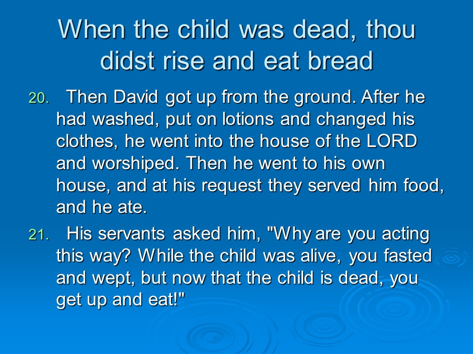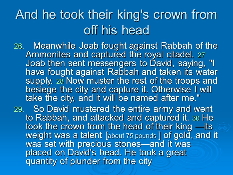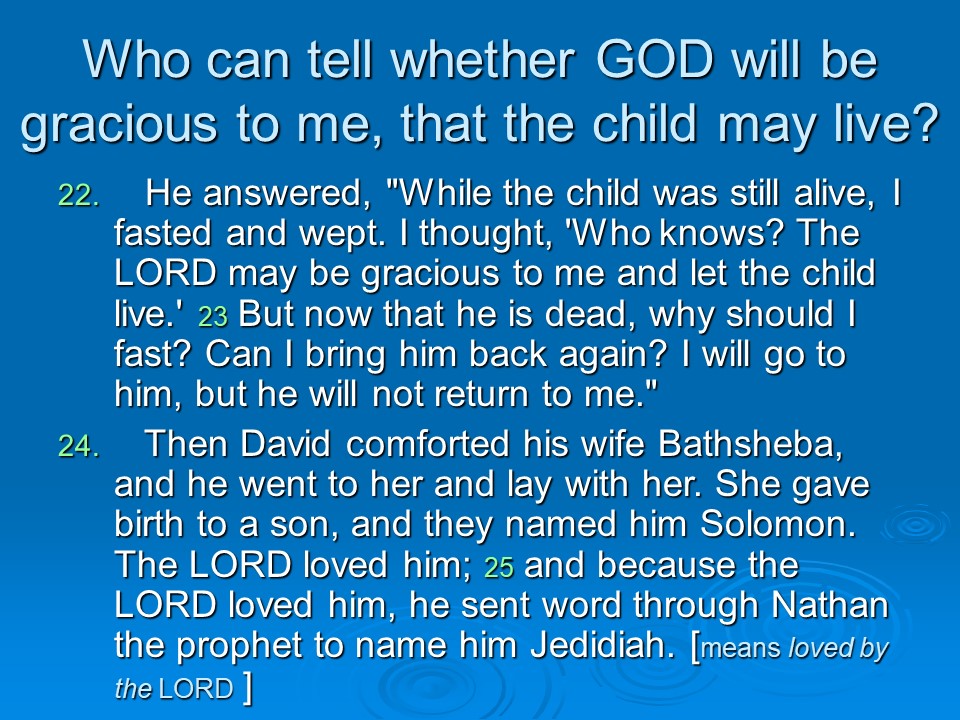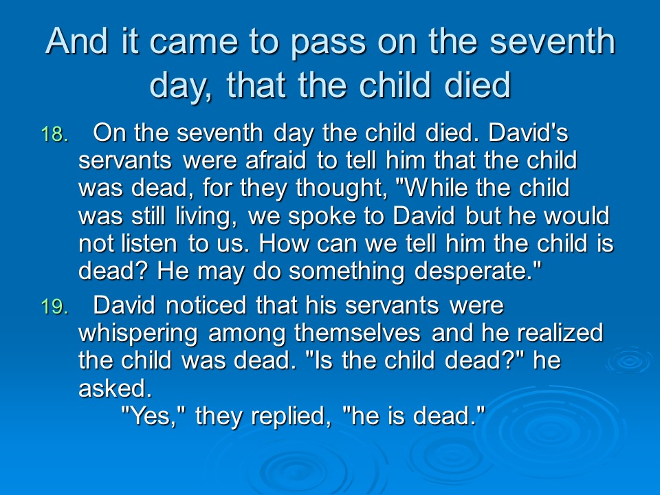 2 Samuel 12. Nathan confronted David about his sin and David Confessed: “I have sinned against the LORD.” It tells of the death of David’s son with Bathsheba, after which a second son, Solomon was born to Bathsheba. Finally, the chapter reverts back to war and David’s men captured Rabbah, a city of the Ammonites.