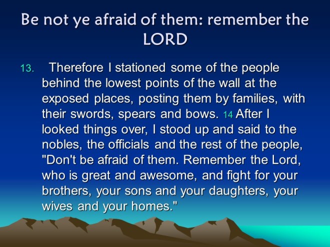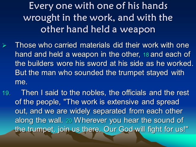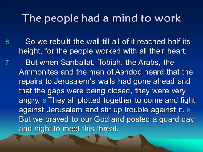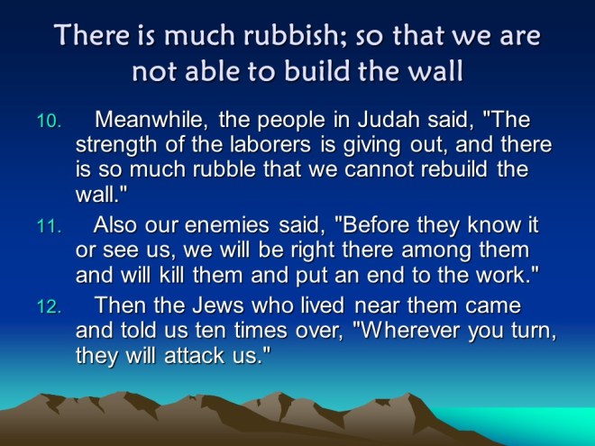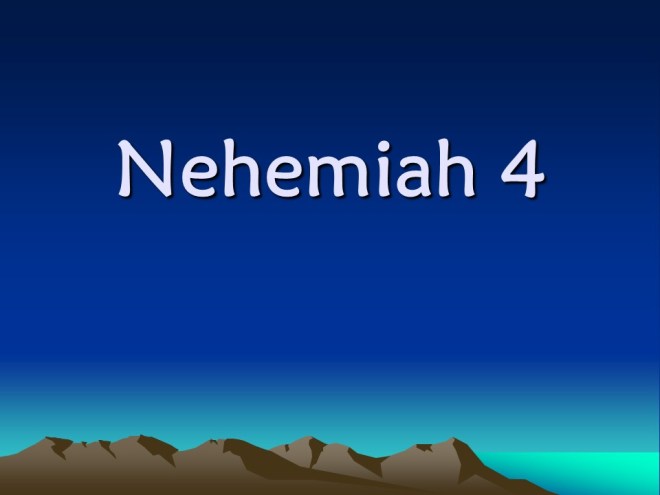 Nehemiah 4. Through strong opposition the building of the wall was defended.