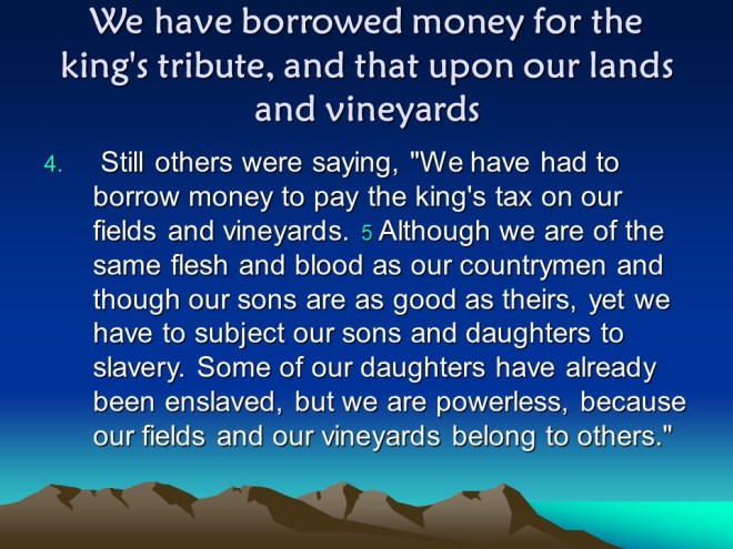 Nehemiah 5. Nehemiah encountered oppression but showed great generosity.