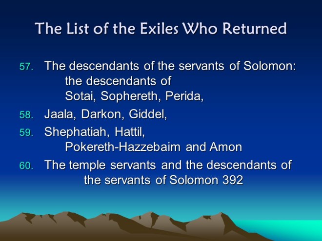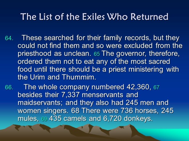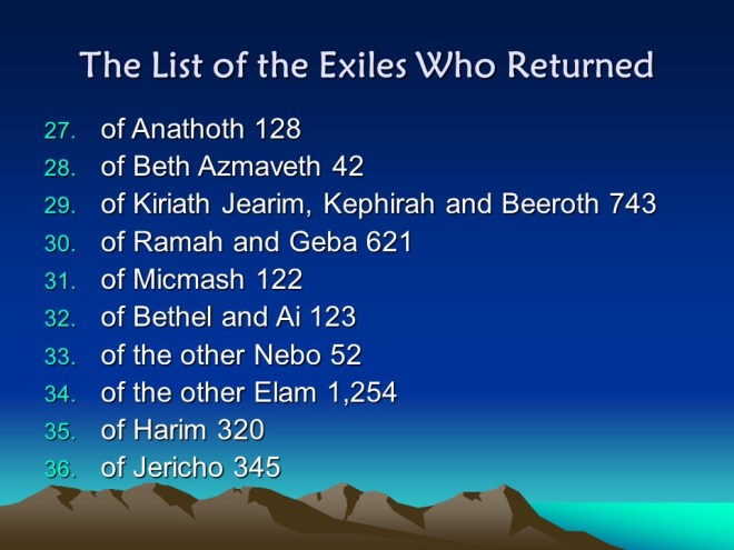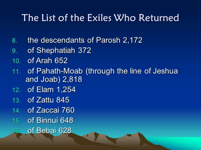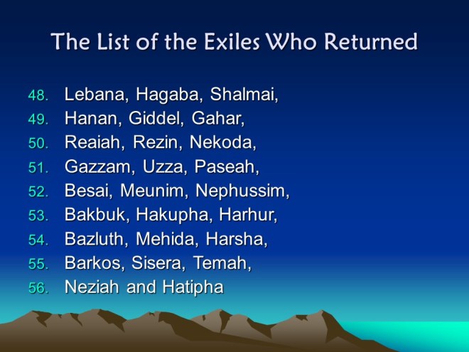 Nehemiah 7. Finally the wall was finished, and the chapter gives a list of the captives who returned to Jerusalem.