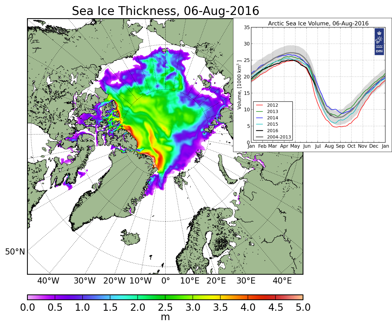 CICE_combine_thick_SM_EN_20150806 The North East Passage  was open for clear sailing the whole Russian coastline and they planned to go through the North East Passage ice choke point, Cape Chelyuskin on or about Aug 5. 2016. It is now Aug 8, and the boat is huddling in a sheltered cove waiting for the ice to melt. Taking a look at the Arctic ice cap for Aug 6, 2016.FullSize_CICE_combine_thick_SM_EN_20160806There seems to be a lot of melting left to be done before they can pass through the choke point.