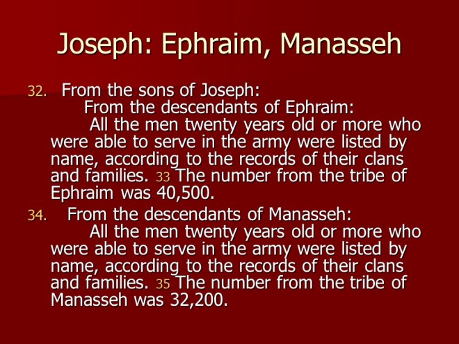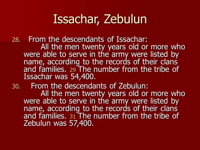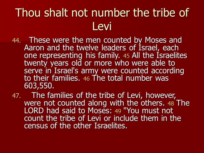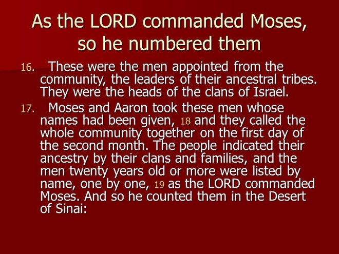 Numbers 1 consists of a listing of the heads of the people that left Egypt, the first census. All the people from the twelve tribes were counted, except the Levites.