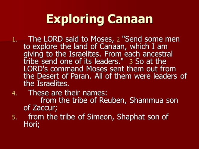 In Numbers 13 God prepared His people to take the land He had promised them, so they were sending out scouts to survey the land and how best to conquer it. They came back with a discouraging report; it is a good land flowing with milk and honey, but the people are too strong for them, they felt like grasshoppers in their sight. Only Caleb dissented. (Joshua joined Caleb in the next chapter).
