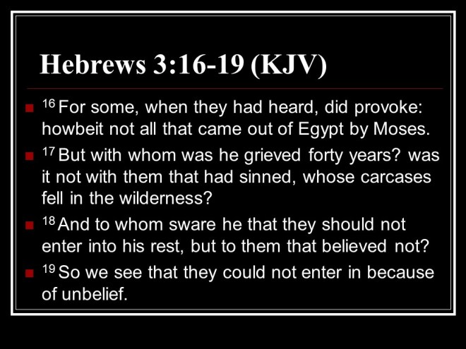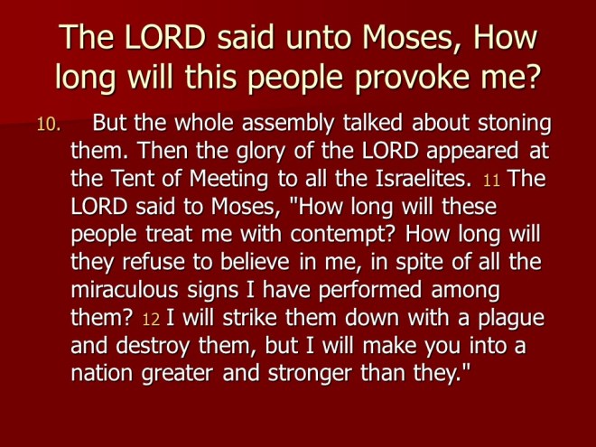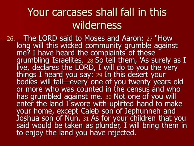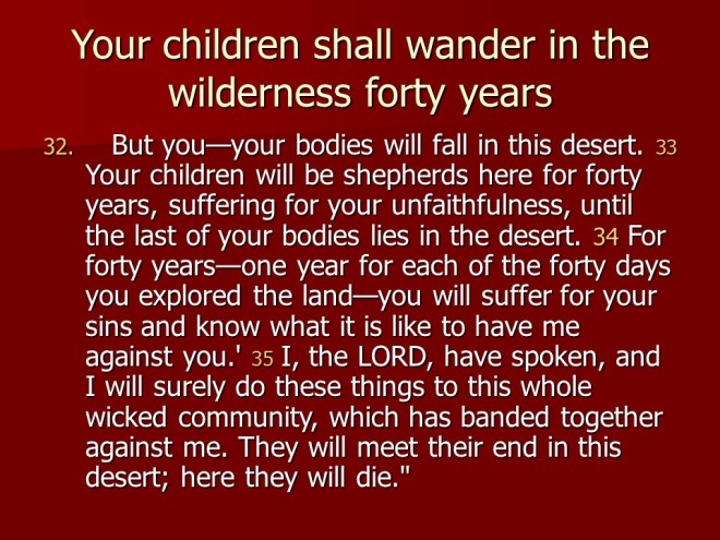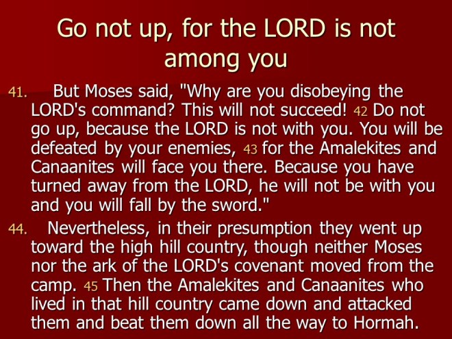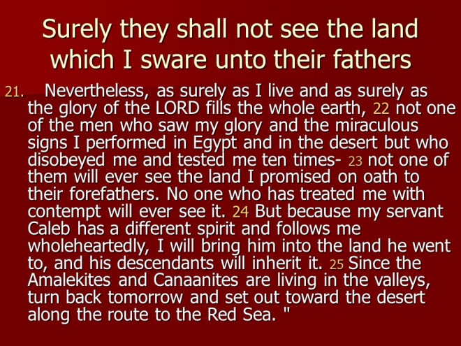 In Numbers 14 the people rebelled and refused to go into the promised land. As a punishment the people had to continue wandering for forty years in the desert until that generation, with the exception of Caleb and Joshua, had passed away. Meanwhile the people tried to take on the Amalekites in their own strength, but failed miserably.