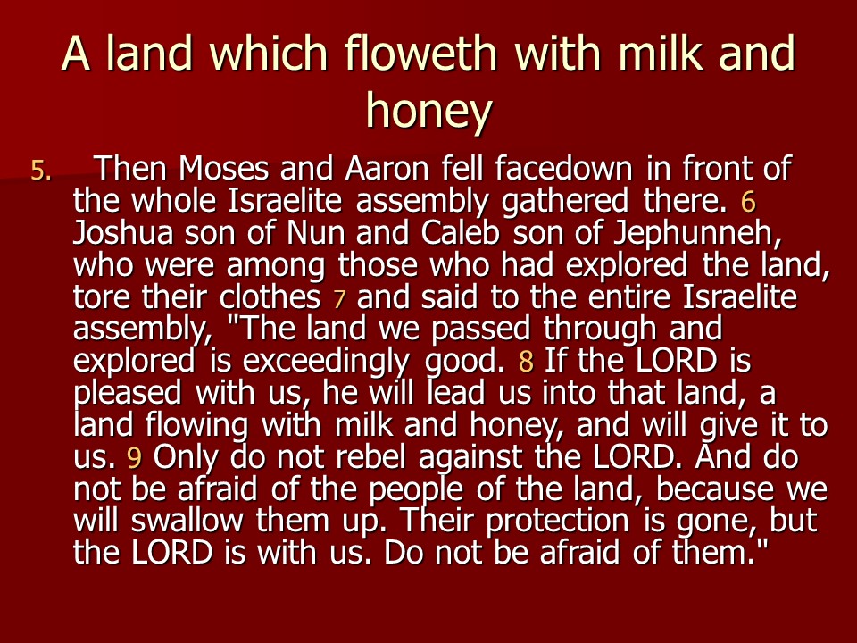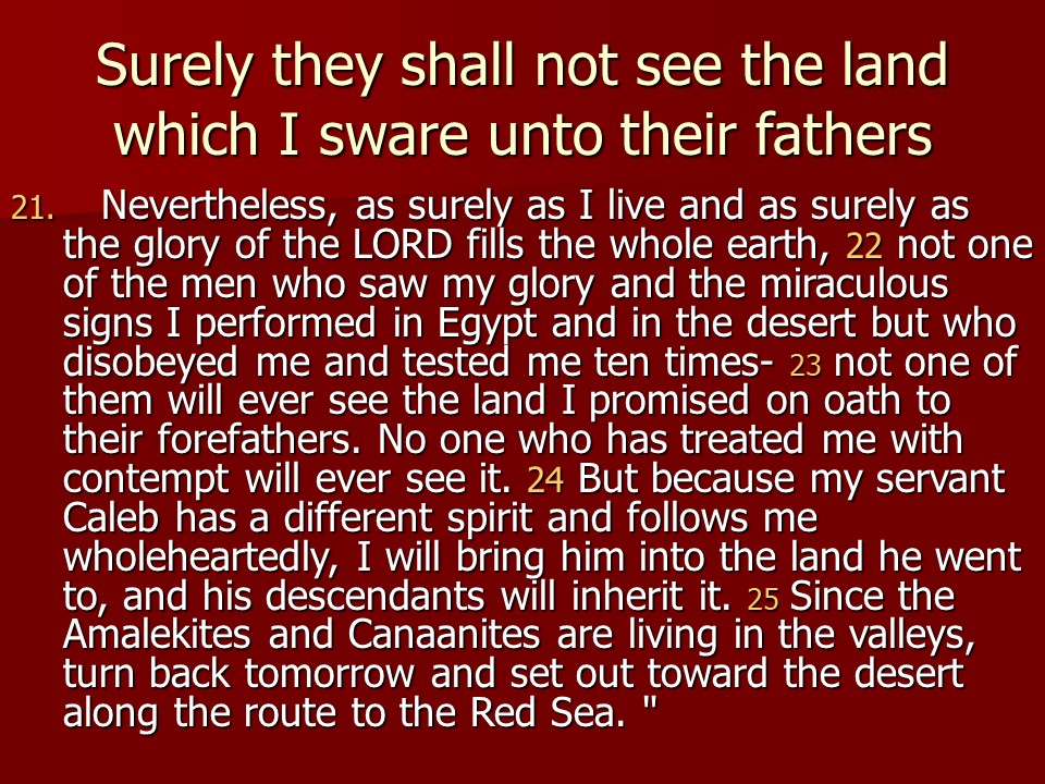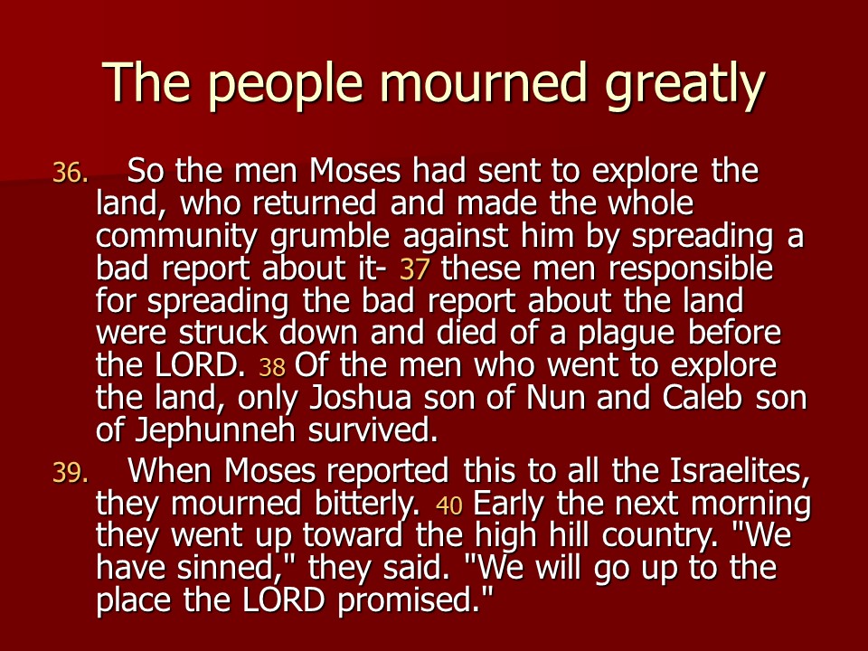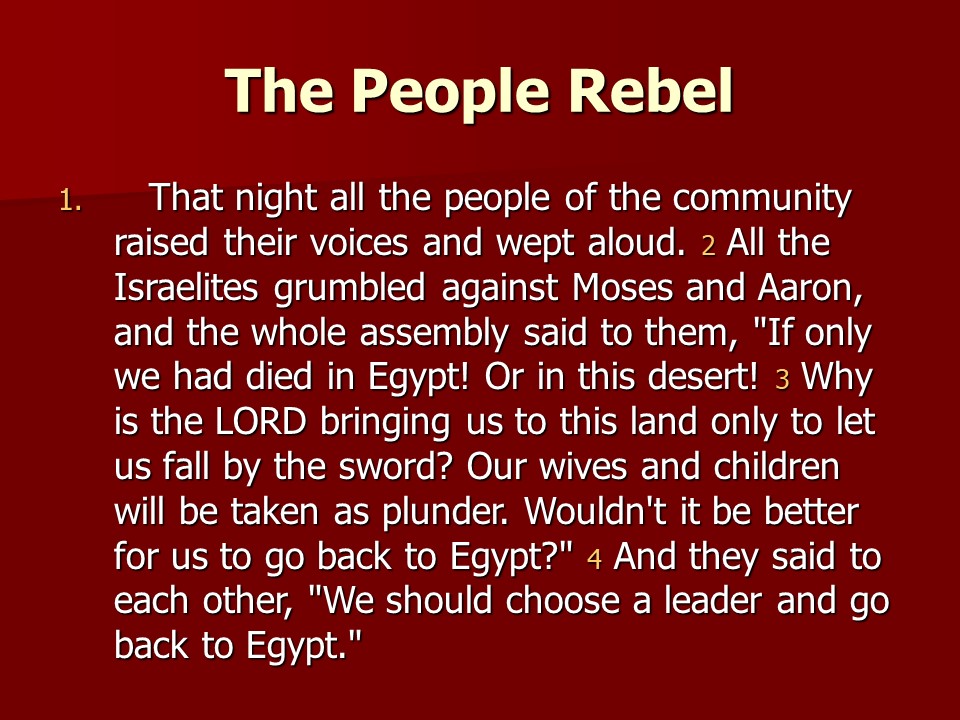 In Numbers 14 the people rebelled and refused to go into the promised land. As a punishment the people had to continue wandering for forty years in the desert until that generation, with the exception of Caleb and Joshua, had passed away. Meanwhile the people tried to take on the Amalekites in their own strength, but failed miserably.