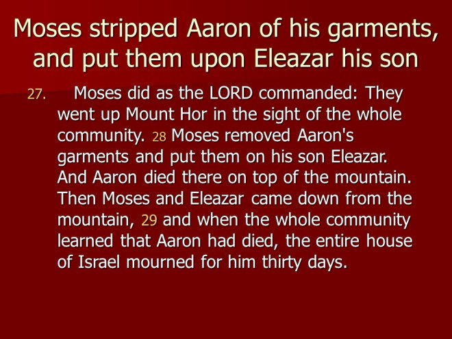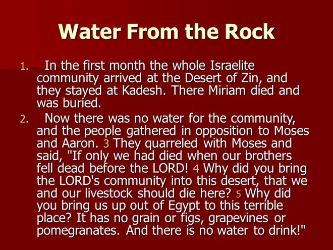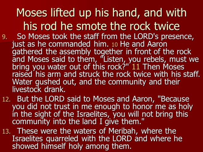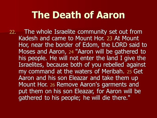 In Numbers 20. Moses committed a major error in Kadesh. Thy were short on water, so God told Moses to speak to the rock. Instead, Moses smote the rock. Water sprung forth but God punished Moses and his people so severely that that generation was not allowed to enter the promised land. Why did God give them this harsh punishment? The rock was to be smitten only once, the second time Moses was to speak to the rock, a foreshadowing of Jesus, who was smitten once for our sins. At the end of the chapter Aaron died.