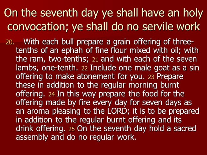 In Numbers 29 the specifications for offerings continue, Offerings at the Feast of Trumpets, Offerings at the Day of Atonement and finally Offerings at the Feast of Tabernacles.