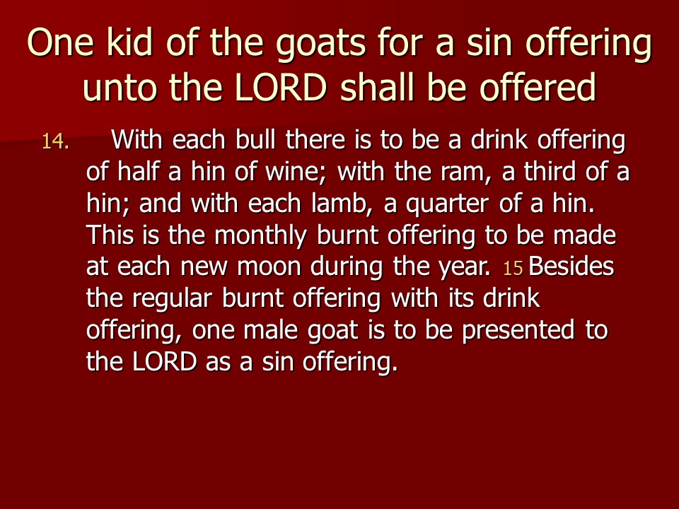 In Numbers 29 the specifications for offerings continue, Offerings at the Feast of Trumpets, Offerings at the Day of Atonement and finally Offerings at the Feast of Tabernacles.