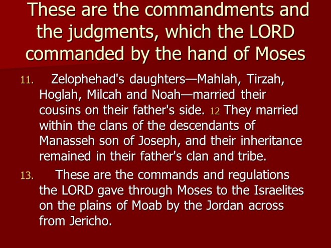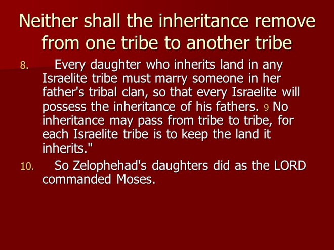 Numbers 36 tells about the Inheritance of Zelophehad’s Daughters and why the Israelite women must marry within their tribe.