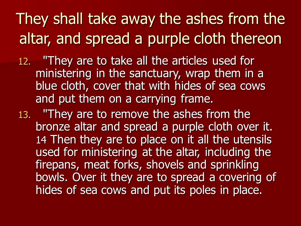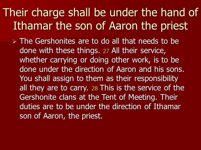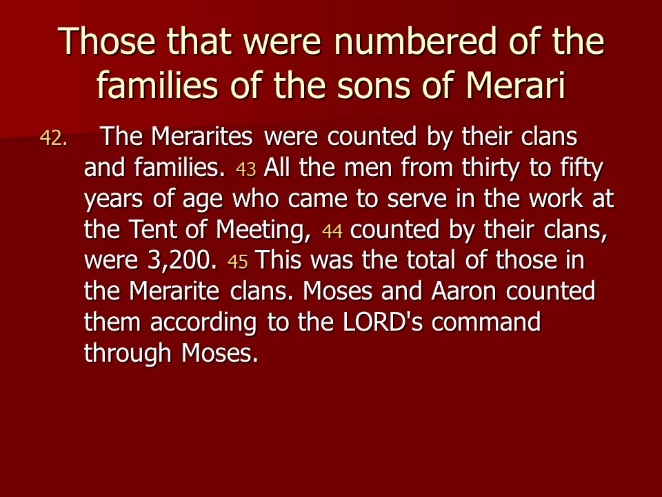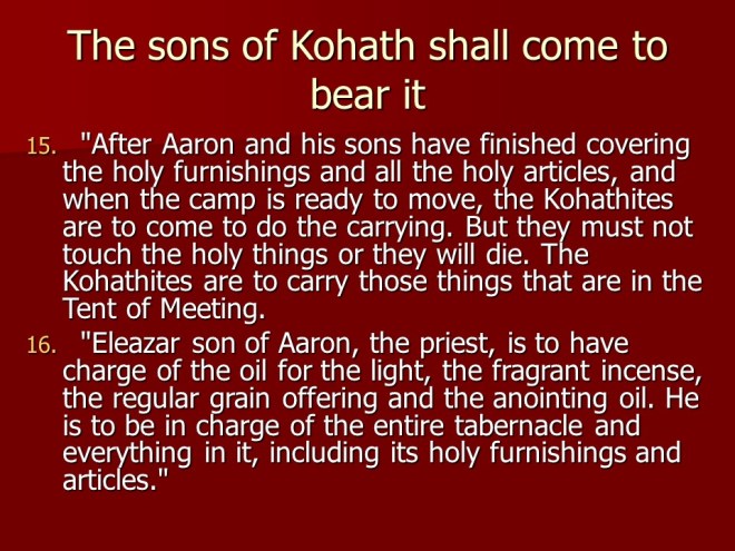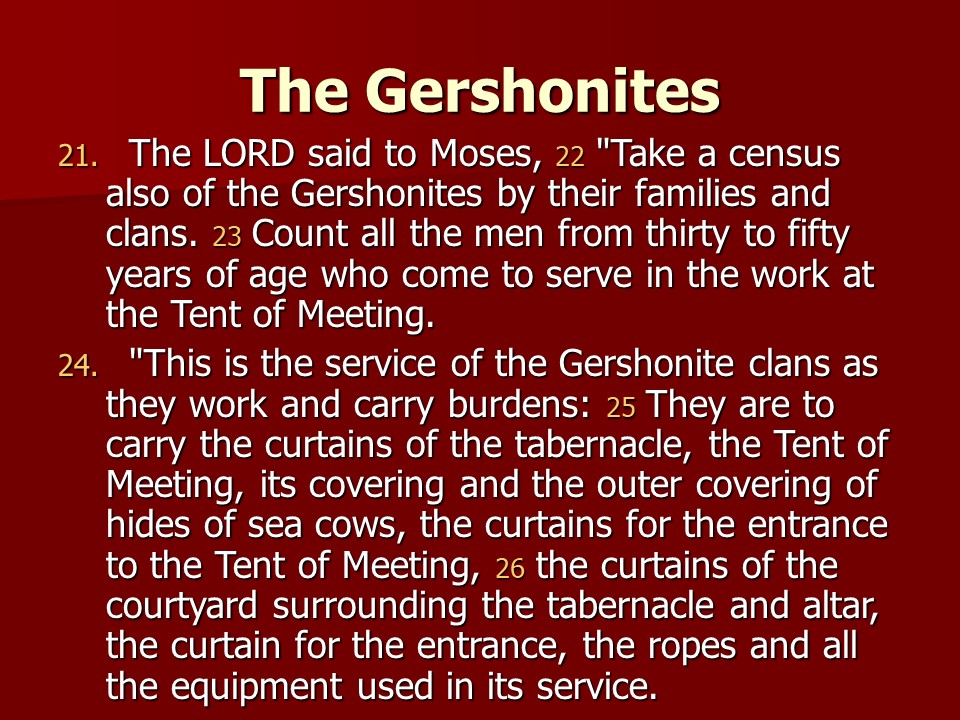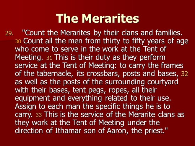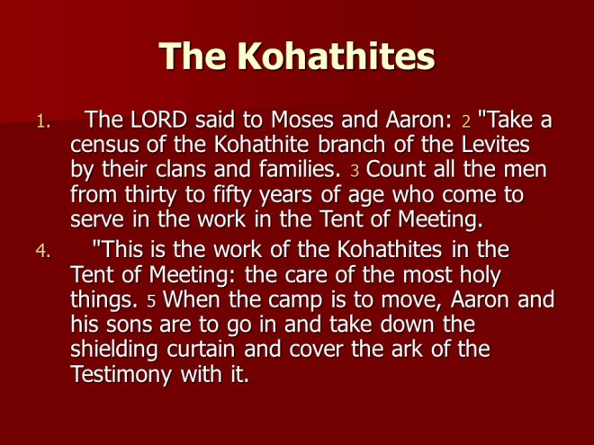 Numbers 4 tells of the duties of the Kohathites, the Gershonites and the Merarites. Then these Levite clans are numbered.