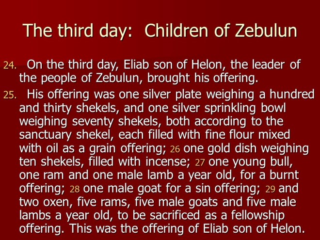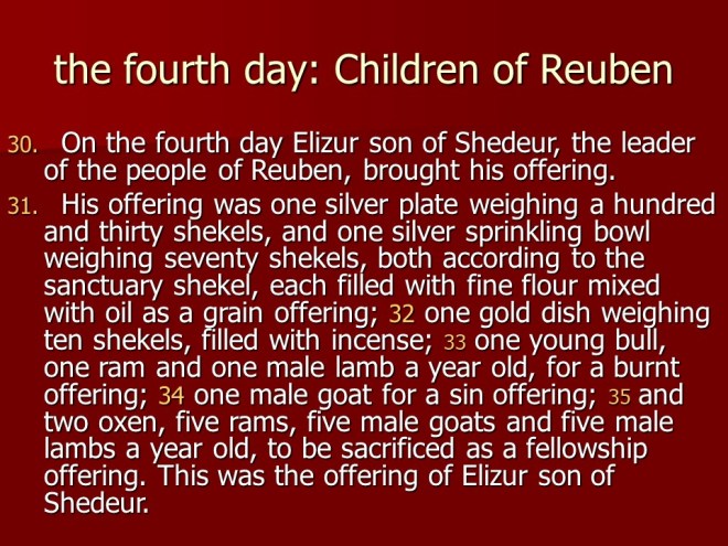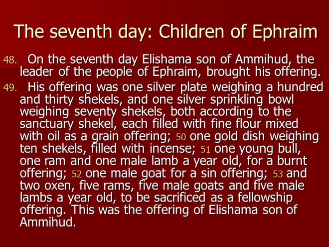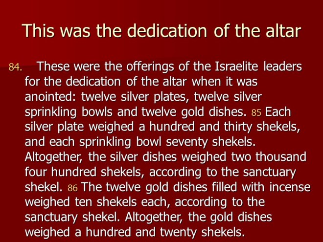 Numbers 6 tells of the vow of the Nazirite, how he (or she!) must separate themselves totally to the LORD, not shave their hair, not eat anything from the grape, not even the dry skin, not touch any dead bodies and so on. When the separation is over an offering must be given. Thankfully the chapter ends with the priestly blessing: “The Lord bless thee, and keep thee: The Lord make his face shine upon thee, and be gracious unto thee: The Lord lift up his countenance upon thee, and give thee peace.“