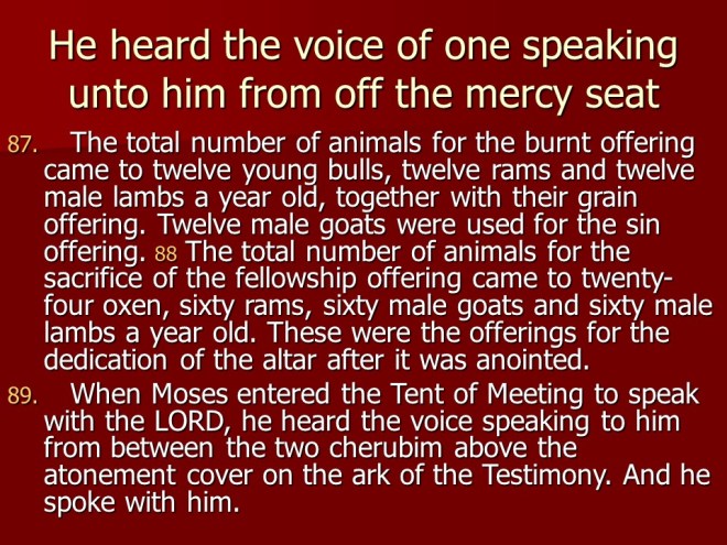 Numbers 7 has 89 verses, but the chapter only seems long since the same offerings for the dedication of the tabernacle are repeated for each of the twelve tribes.
