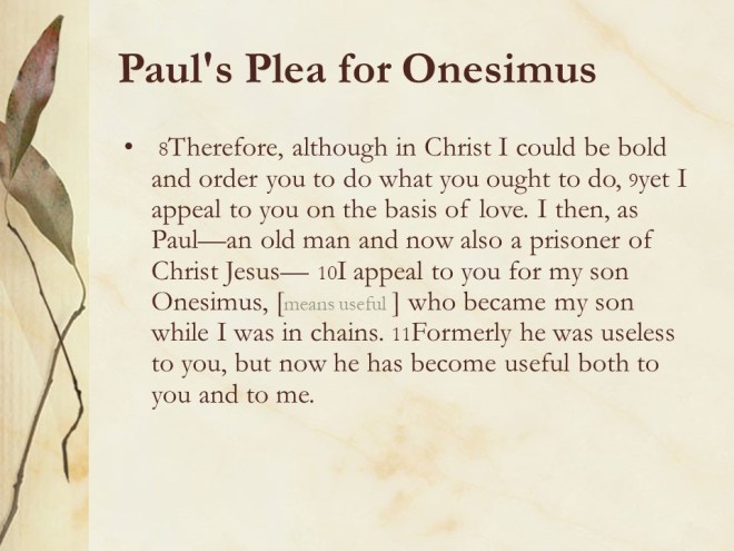 Philemon had the right to punish Onesimus and recapture him as a slave, but because of Paul’s faith in the redemptive powers of Christ he is sending him anyway.