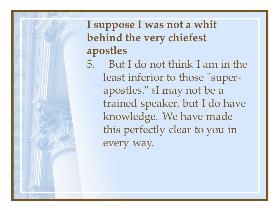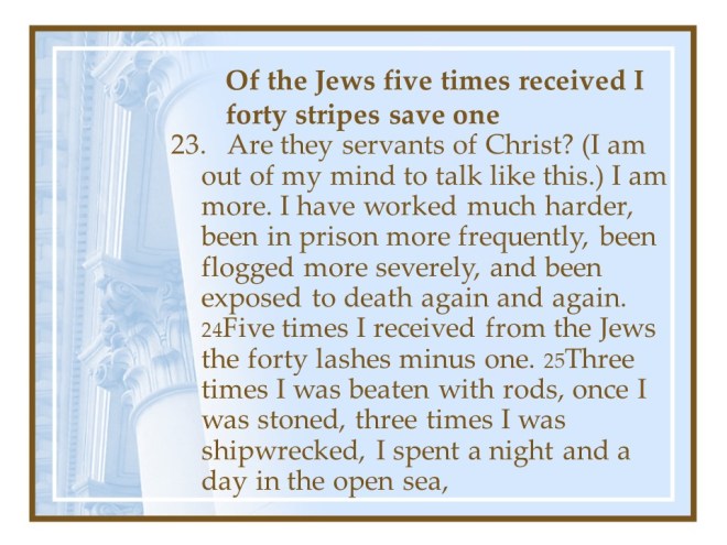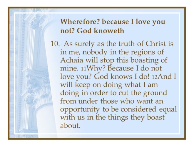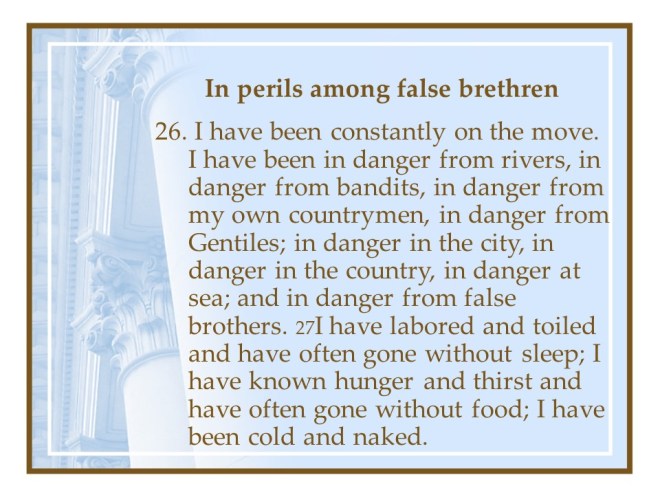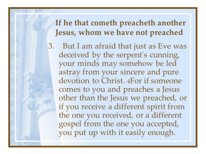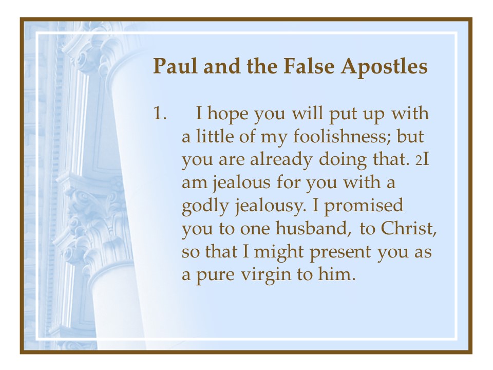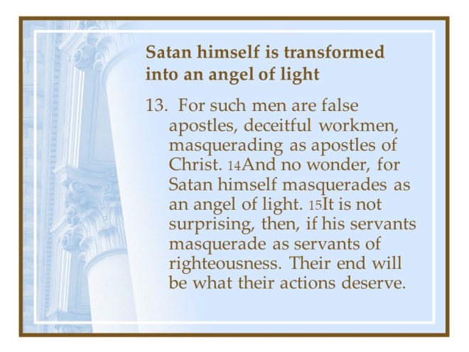 2 Corinthians 11. The Apostle Paul showed concern for the Corinthians’ faithfulness, warned them against false Apostles, “for Satan himself is transformed into an angel of light.” He then put forward a reluctant boasting about his sufferings for Christ.