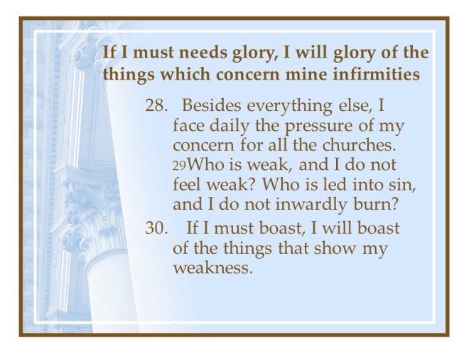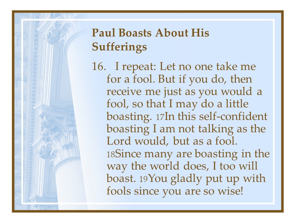 2 Corinthians 11. Paul showed concern for the Corinthians faithfulness, warned them against false Apostles, “for Satan himself is transformed into an angel of light.” Paul put forward a reluctant boasting about his sufferings for Christ.