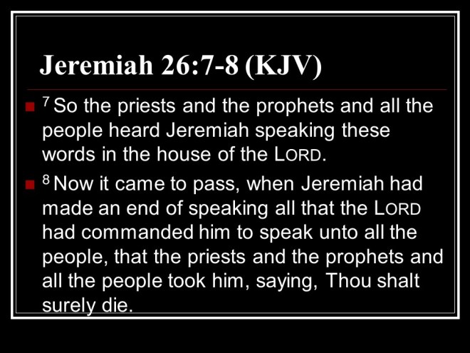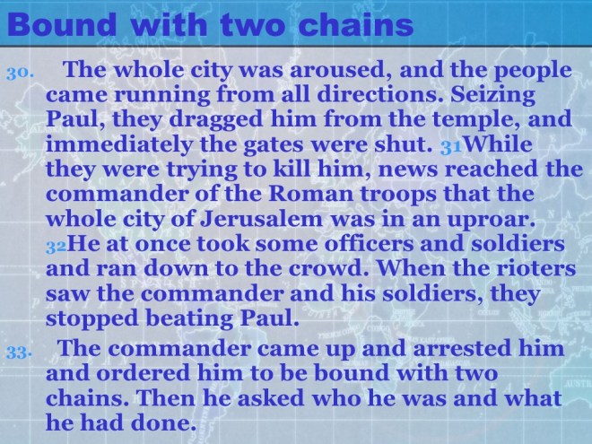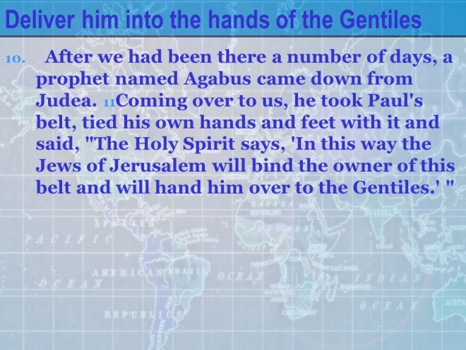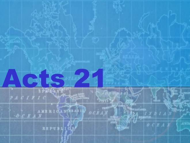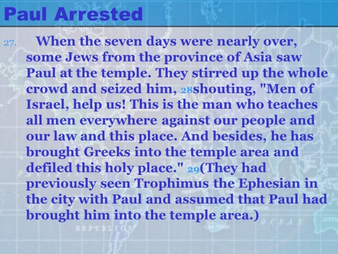 Acts 21. On the way to Jerusalem the Apostle Paul was warned everywhere by the Holy Spirit not to go, but Paul continued unmoved, and people finally gave up, saying ‘The Lord’s will be done’. Paul was urged to make peace and purify himself with four other Jews that had taken a vow, which he did. A mob was stirred up anyway and Paul was arrested in the Temple. Because Paul was a Roman citizen he was allowed to address the Jerusalem mob.