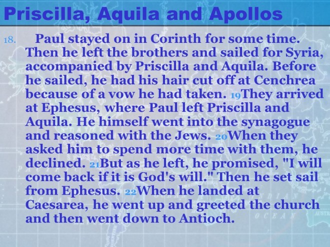 Acts 18:9-28. The Apostle Paul left Athens and went to Corinth where he stayed a year and a half, teaching many in the city, among them Priscilla and Acquila. The three of them went to Ephesus, where Paul left Priscilla and Acquila and went to Antioch. Priscilla and Acquila met Apollos, a learned man preaching the baptism of John. “When Aquila and Priscilla had heard, they took him unto them, and expounded unto him the way of God more perfectly. And when he was disposed to pass into Achaia, the brethren wrote, exhorting the disciples to receive him: who, when he was come, helped them much which had believed through grace: For he mightily convinced the Jews, and that publicly, shewing by the scriptures that Jesus was Christ.”