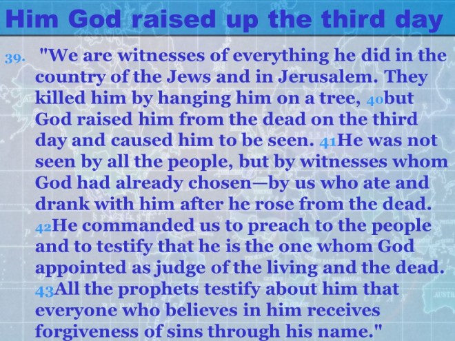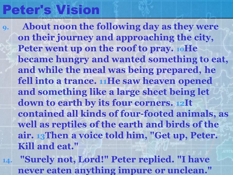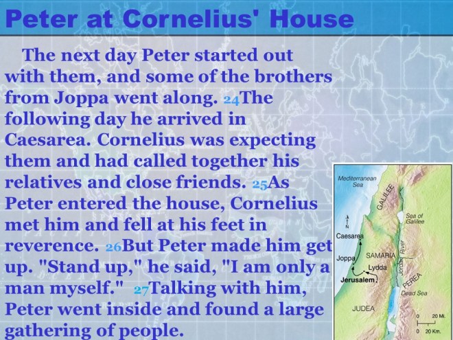 Acts 10, Cornelius calls for Peter, Peter’s vision, from Joppa to Caesarea, Peter meets Cornelius, the Gospel presented to Cornelius’ Household, the Holy Spirit falls on the Gentiles.