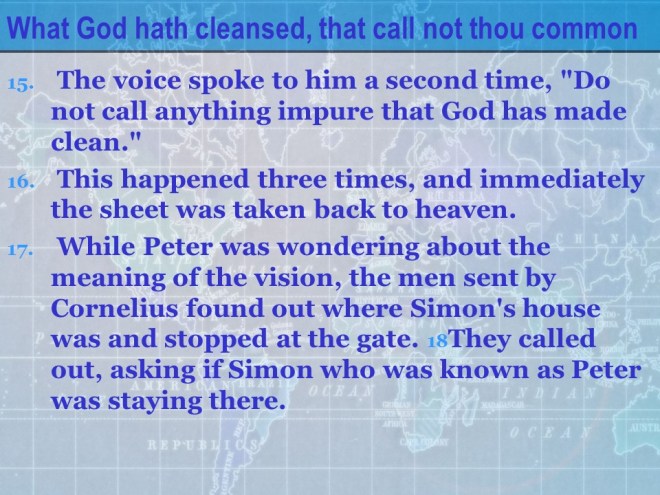 Acts 10. Cornelius, a Roman centurion called for Peter to come. That same day  Peter had a vision about eating all food, including unclean food. Peter protested, but the voice in the vision told him “What God hath cleansed, that call not thou common.“ Peter followed Cornelius’ servants  from Joppa to Caesarea, where he met Cornelius and presented the Gospel to Cornelius’ household. They all believed,  the Holy Spirit fell on them and they were baptized, and so they became the first gentiles to be converted.