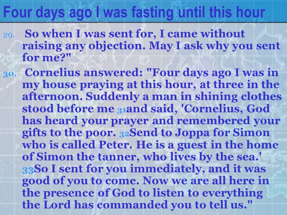 Acts 10, Cornelius calls for Peter, Peter’s vision, from Joppa to Caesarea, Peter meets Cornelius, the Gospel presented to Cornelius’ Household, the Holy Spirit falls on the Gentiles.