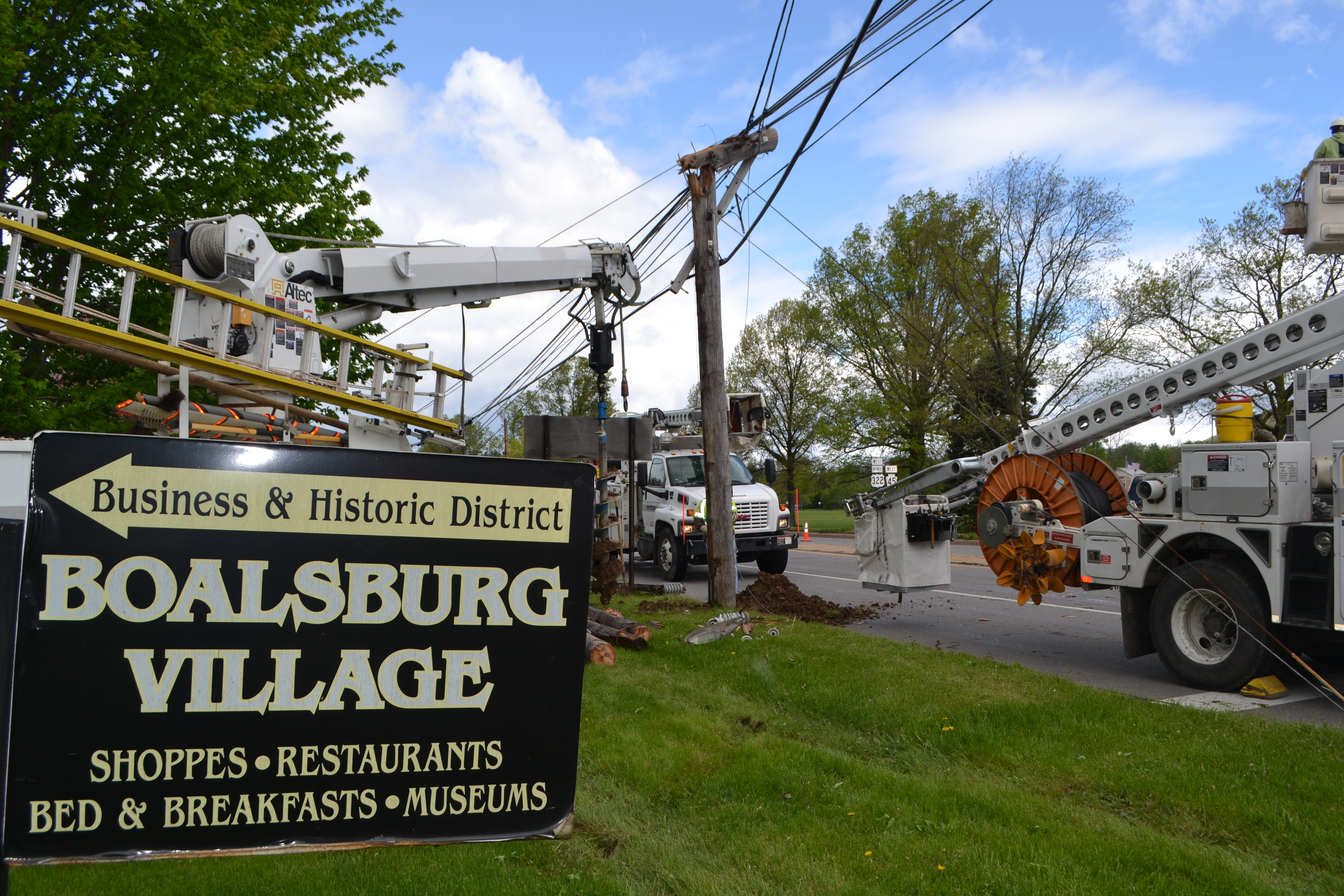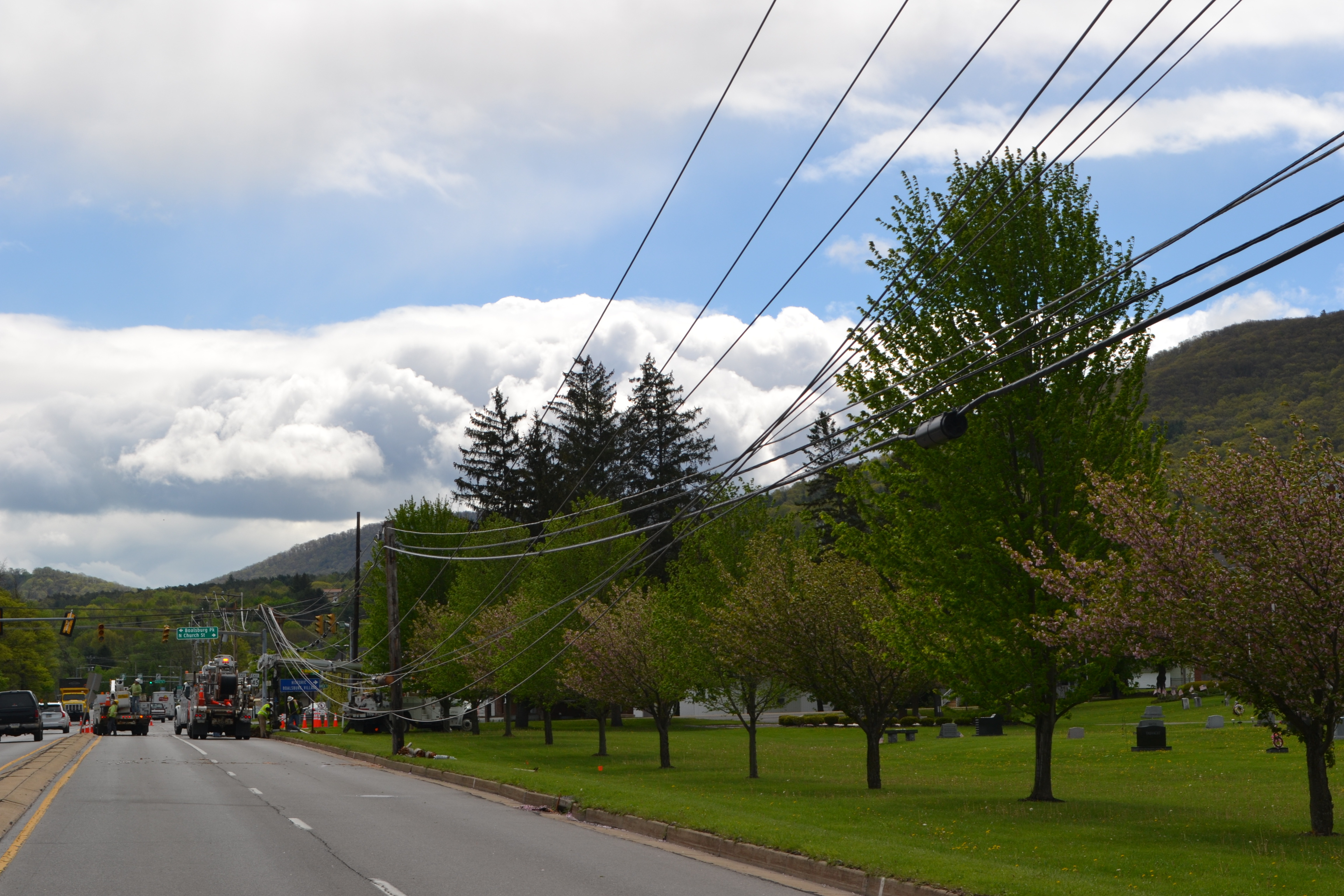 On Monday, at 6:35 P.M. a squall line came by our quaint little village. The down-burst did, as so often happens in historical villages with old trees, take down a few trees, which luckily did not do much harm to the buildings. The trees had been for the most part been well pruned, except a few maple trees that had just done this year’s growth and were at their most vulnerable, so a few secondary power lines went down. The major problem was four poles in a row along the major road snapped, even though no falling trees were involved. How can that happen? These were wooden poles, showing their age, badly overloaded with one high voltage line on top, one intermediate voltage in the middle, telephone and cable lines galore below, placed too far apart so the power lines resonated and swayed harder and harder until the lines snapped. We lost power for one day, most lost power for two days, and power is not yet restored to all customers.