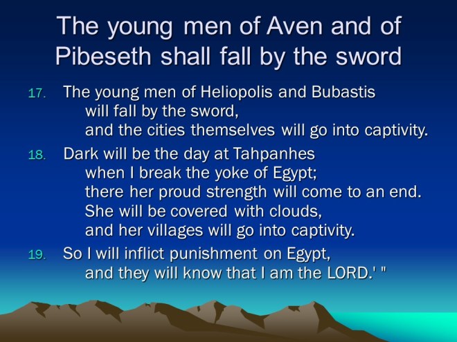 Ezekiel 30. Egypt and her allies may look strong, but they will fall. The Lord proclaimed that Pharaoh would fall and the Egyptians be scattered among the nations.