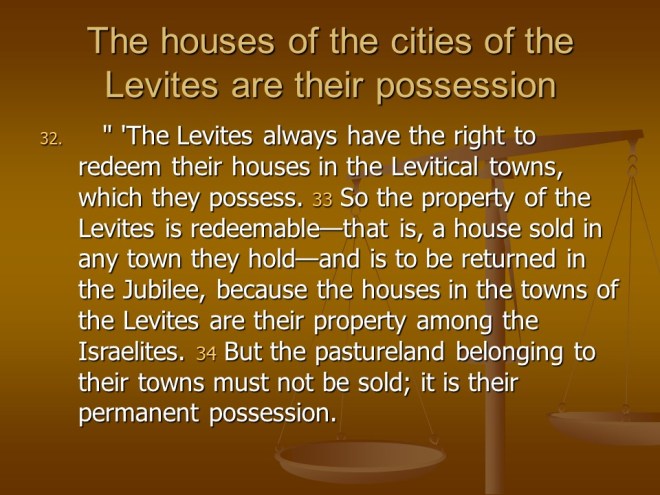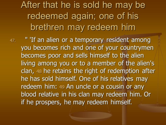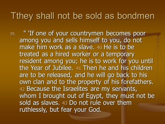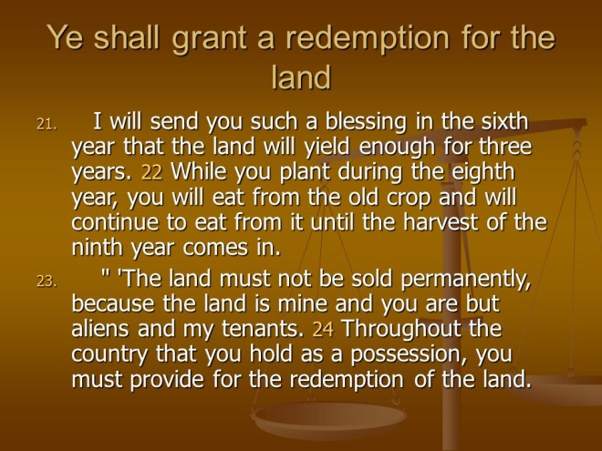 Leviticus 25 defines the Sabbath year, a year of rest for the land, and the year of the jubilee, the year when property is restored, rights redeemed, and slaves are set free. (As far as I know the year of the jubilee was never celebrated)