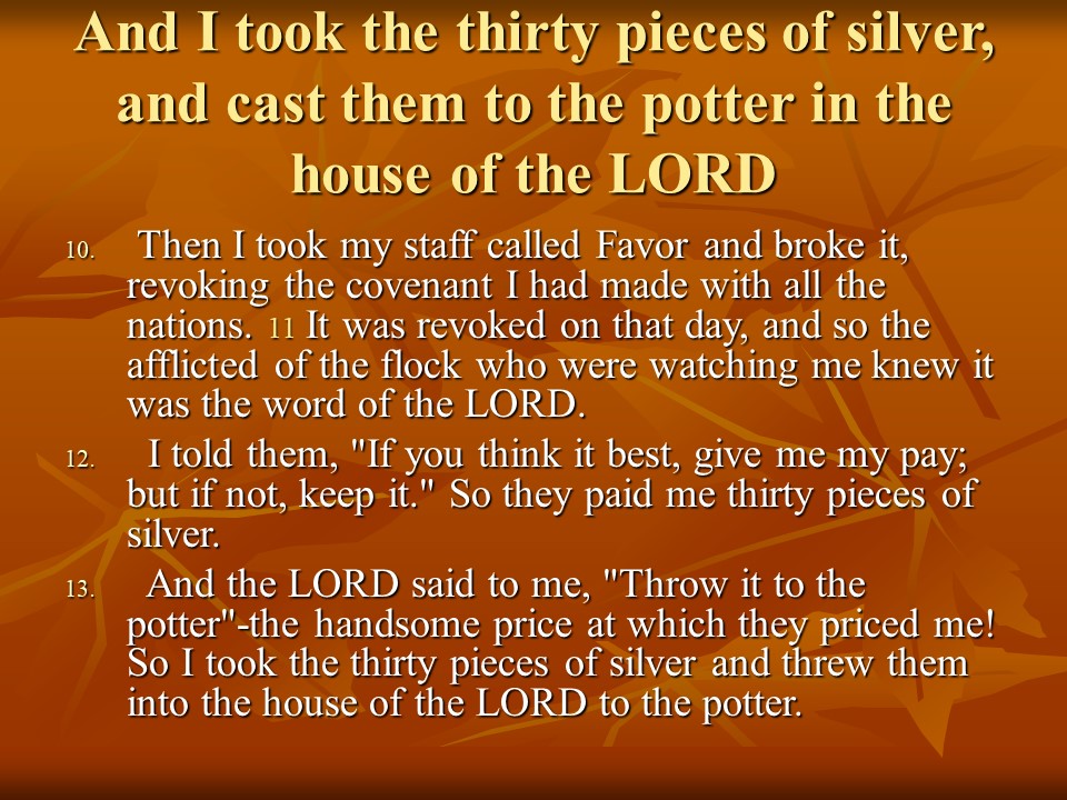 Zechariah 11. The LORD  proclaimed judgement on Israel, but after that comes the prophecy of the shepherds. This chapter also contains the famous quote: “I said unto them, If ye think good, give me my price; and if not, forbear. So they weighed for my price thirty pieces of silver. And the Lord said unto me, Cast it unto the potter: a goodly price that I was prised at of them. And I took the thirty pieces of silver, and cast them to the potter in the house of the Lord.