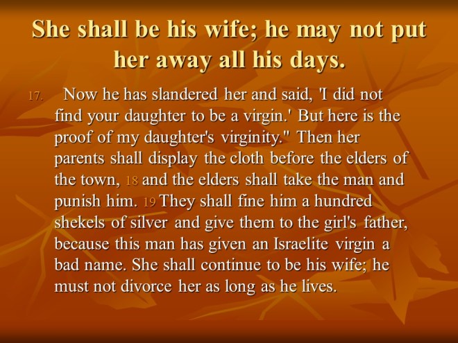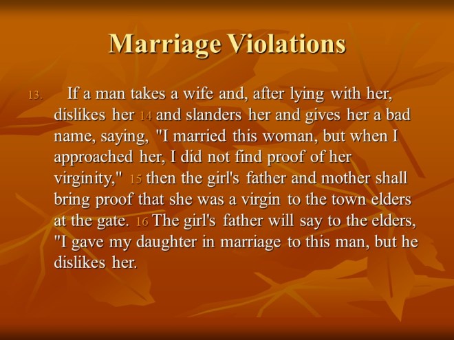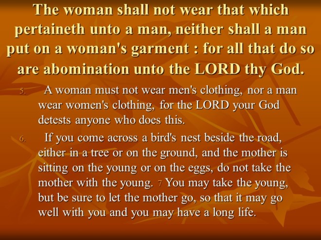 Deuteronomy 22 contains more instructions, protect your brother’s property, the LORD detests unisex clothing, protect nesting birds, do not yoke an ox and a donkey together. The chapter ends with various laws on sexual morality.