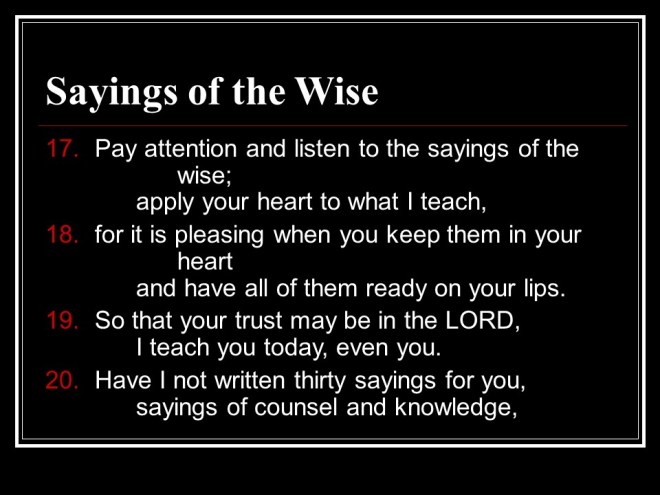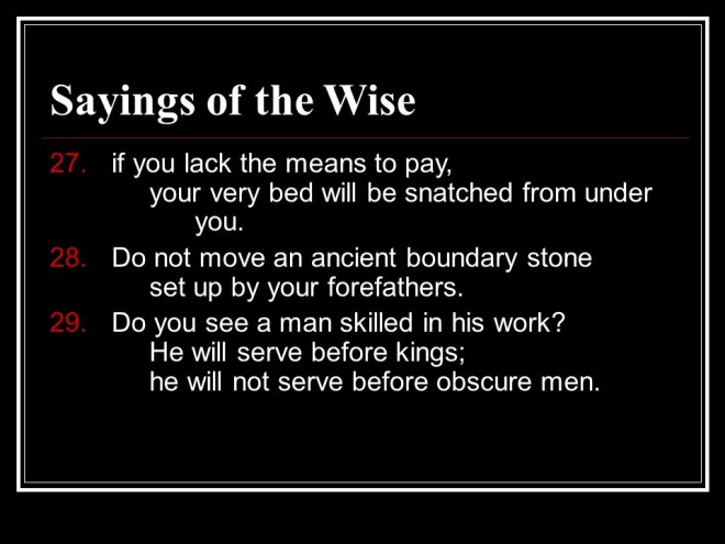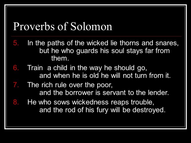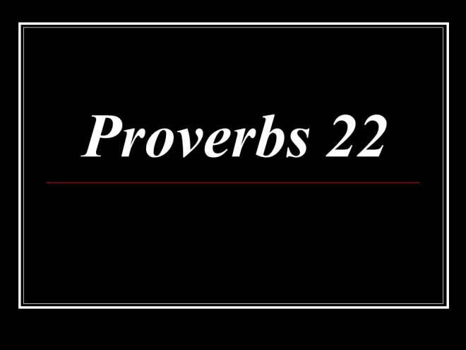 Proverbs 22, Proverbs of Solomon. This is a great chapter of wise advice, how to handle riches, and if not – how to come to poverty, how to raise children properly and how not to be a sluggard. It also contains some sayings of the wise.