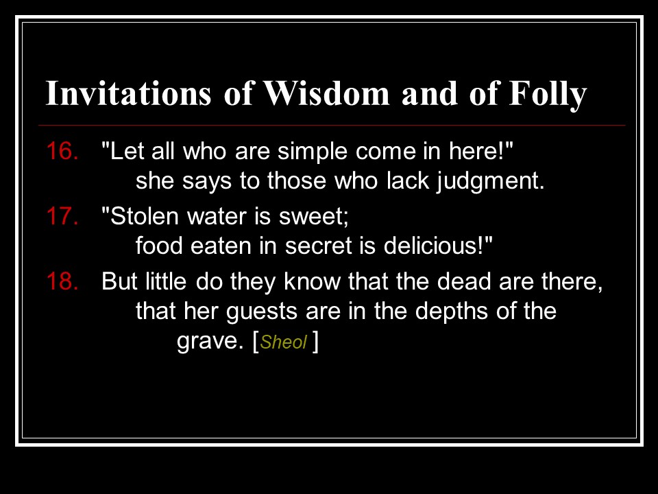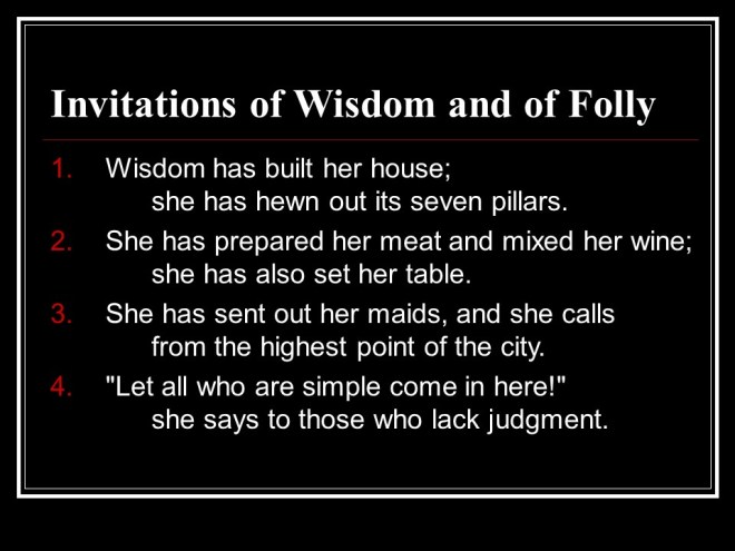 Proverbs 9 contrasts the way of wisdom from the way of folly.