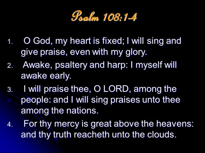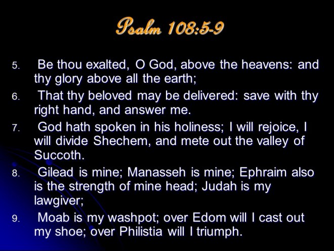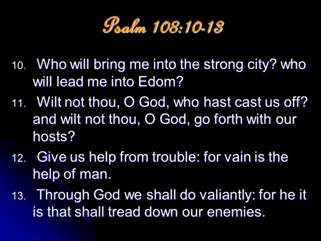 Psalm 108, a Psalm, a song of David. Here David repeated parts from Psalm 57 and Psalm 60 and used it to ask for God’s help in his further conquests as he subdued nations around him.