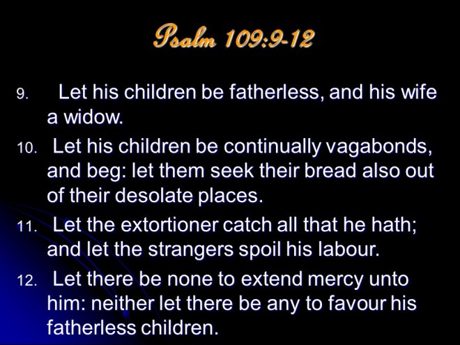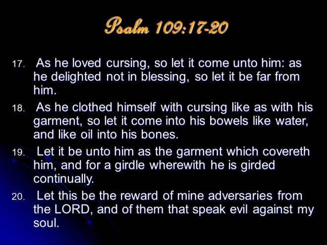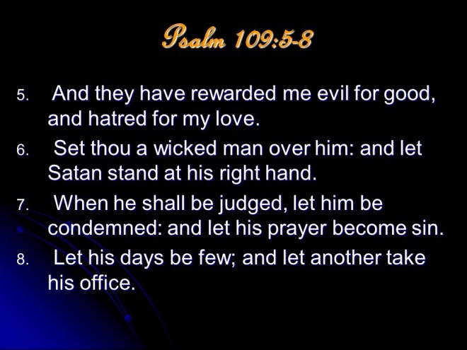 Psalm 109, of David. Leaving vengeance to God, David prayed for the full measure of God’s vengeance to be poured out on his wicked enemies. He is “poor and needy” and vengeance is God’s business.