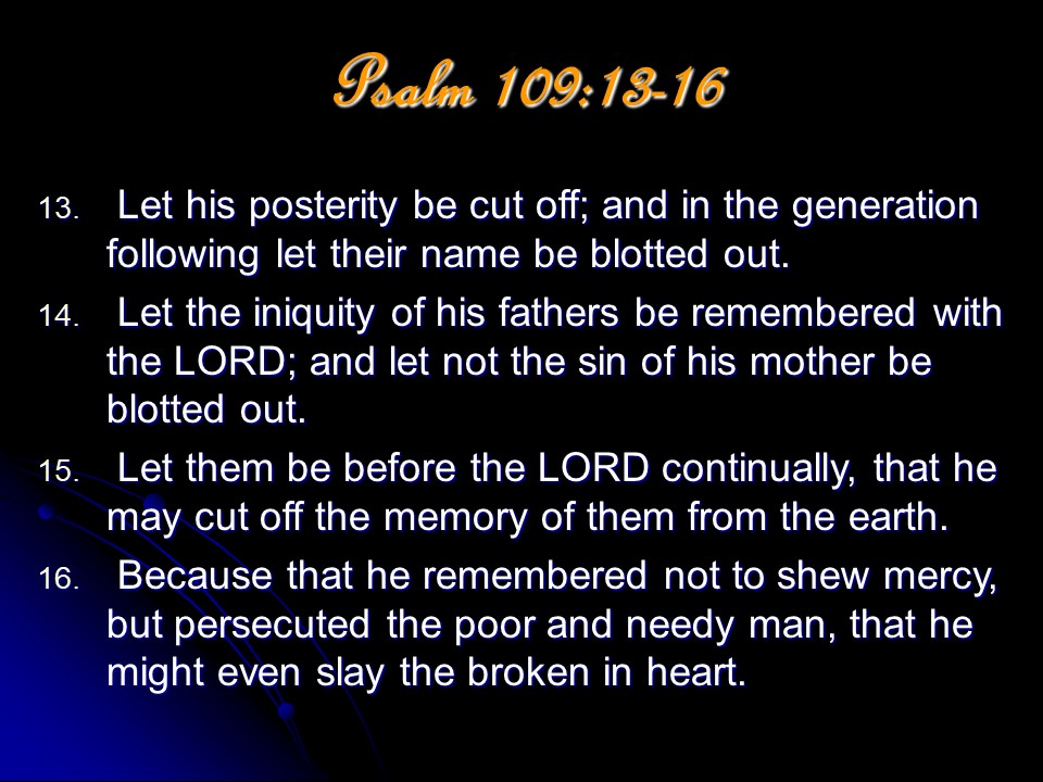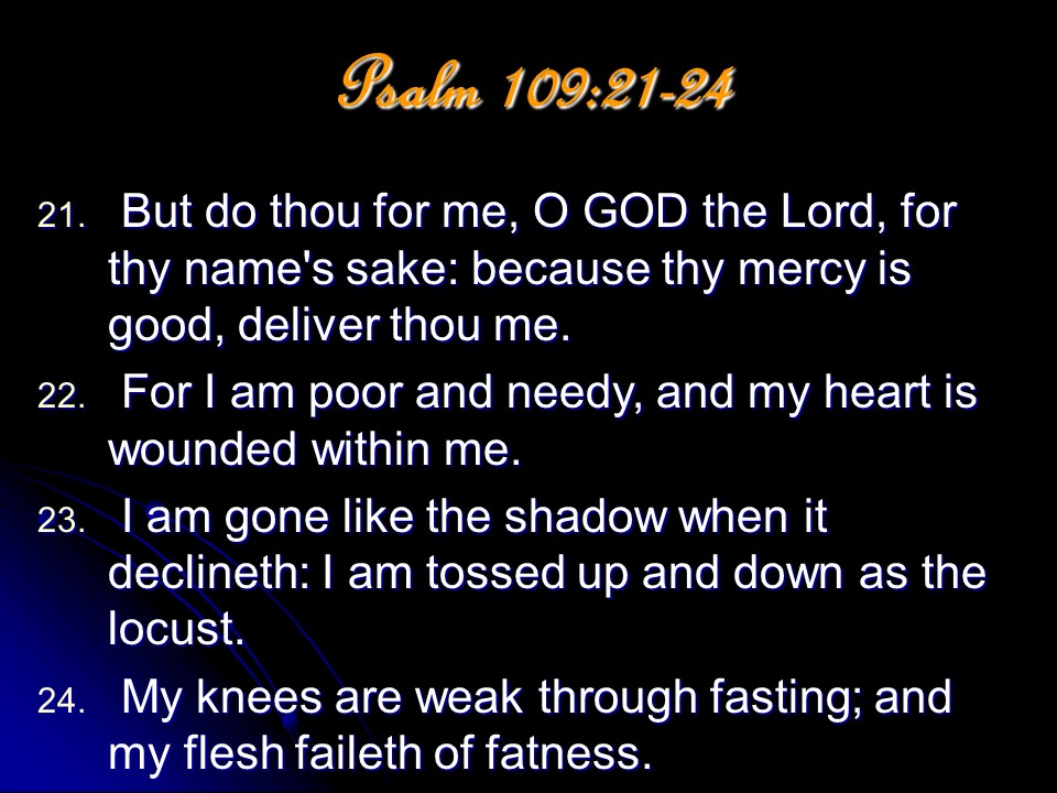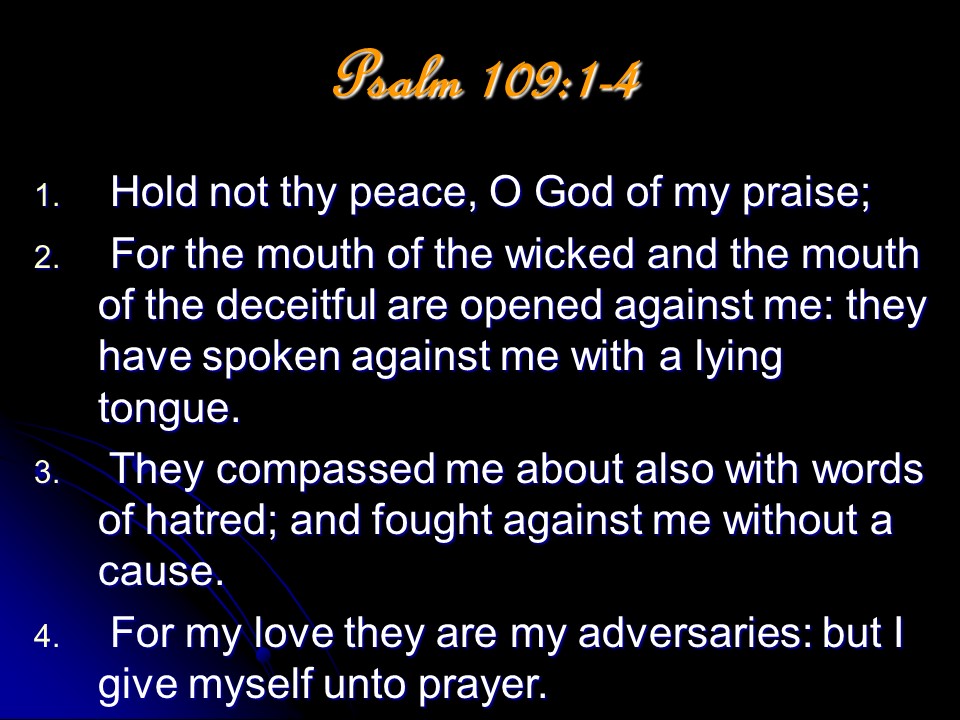 Psalm 109, of David. Leaving vengeance to God, David prayed for the full measure of God’s vengeance to be poured out on his wicked enemies. He is “poor and needy” and vengeance is God’s business.