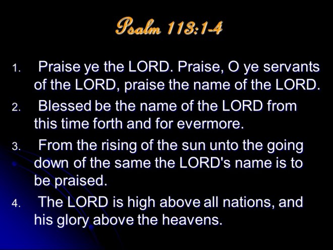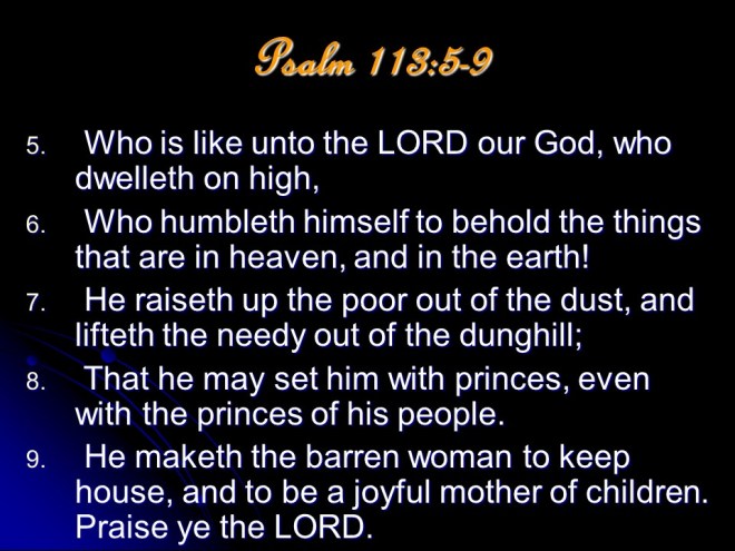 Psalm 113. This Psalm is part of the “Hallel”, consisting of Psalm 113-118. Two are sung before and three after the Passover meal. It begins and ends with Hallelujah, and praises God how He lifts up the lowly, even the barren woman.