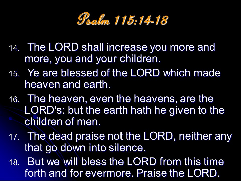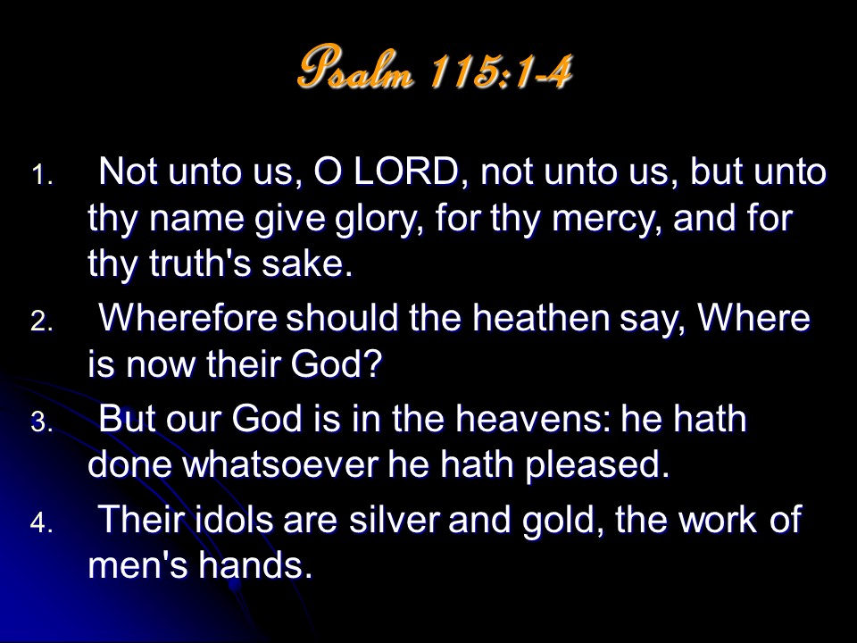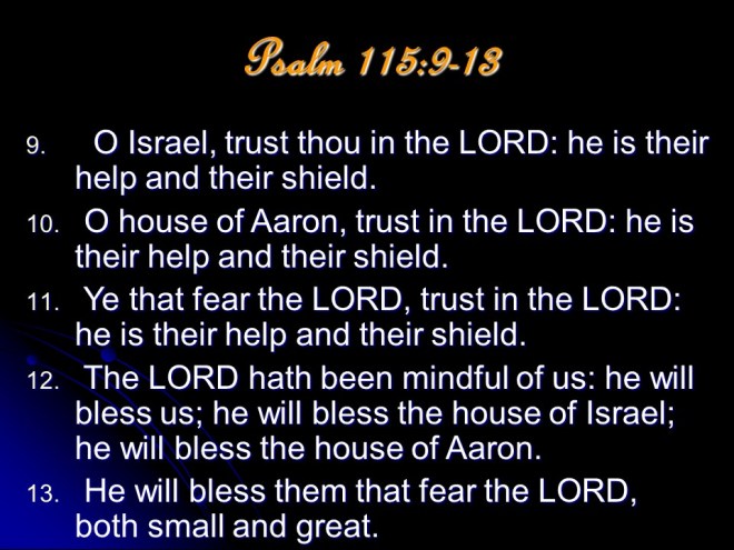 Psalm 115 through Psalm 118 are part of the Hallel (praise) Psalms and are sung after the Passover meal. Psalm 115 gives praise that the Lord is our help and shield. Not so the heathens, their idols are worthless.