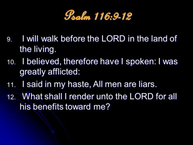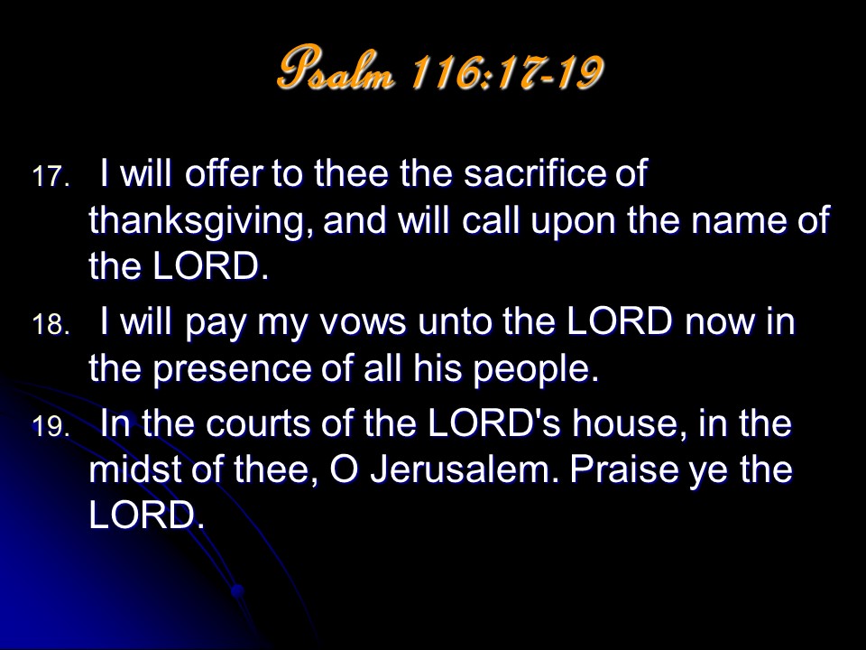 Psalm 116. The Lord heard my prayers, I will pay my vow of gratitude with the sacrifice of praise.