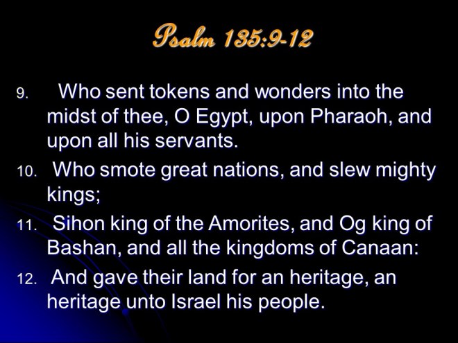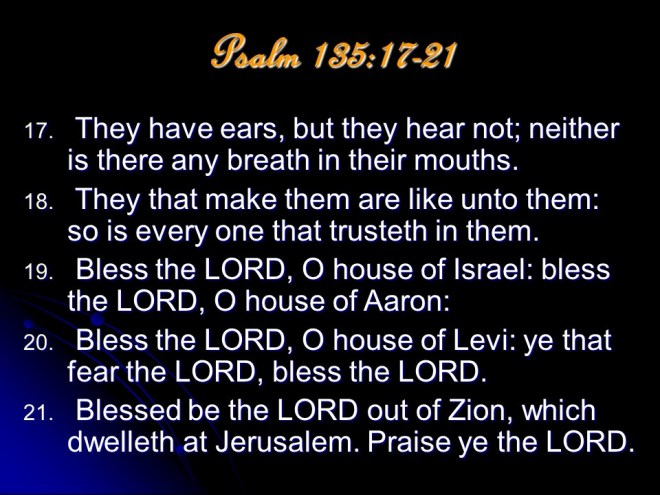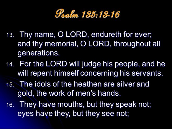 Psalm 135 is a Psalm of praise and thanksgiving to the uniqueness and superiority of the LORD, His name and all that He has done! Compare that to the worthless idols!