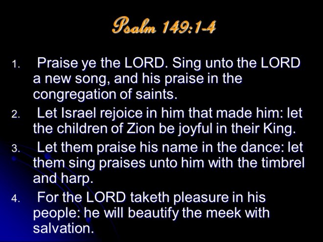 Psalm 149. Praise the LORD and sing a new song. With the two-edged sword (of the spirit) the saints will execute judgement on the nations.