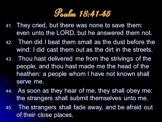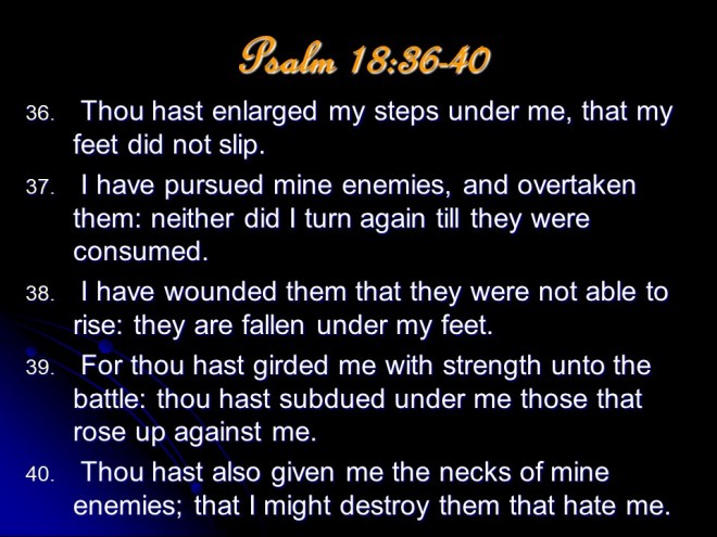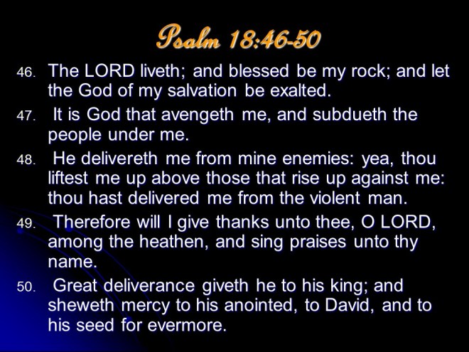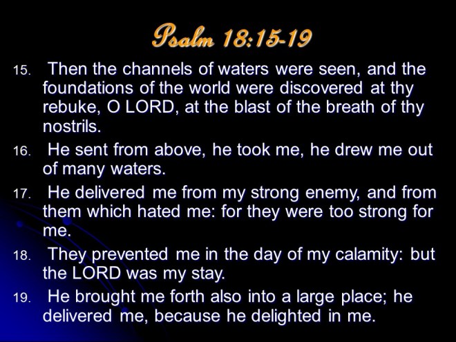 Psalm 18 is the fourth longest psalm. David wrote it ” To the Chief Musician. A Psalm of David the servant of the LORD, who spoke to the LORD the words of this song on the day that the Lord delivered him from the hand of all of his enemies and from the hand of Saul. And he said:” (Read it, ponder and enjoy.)