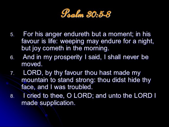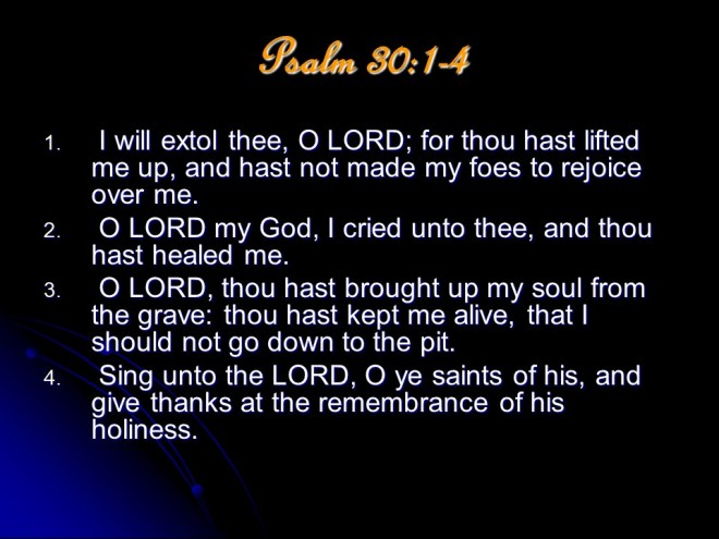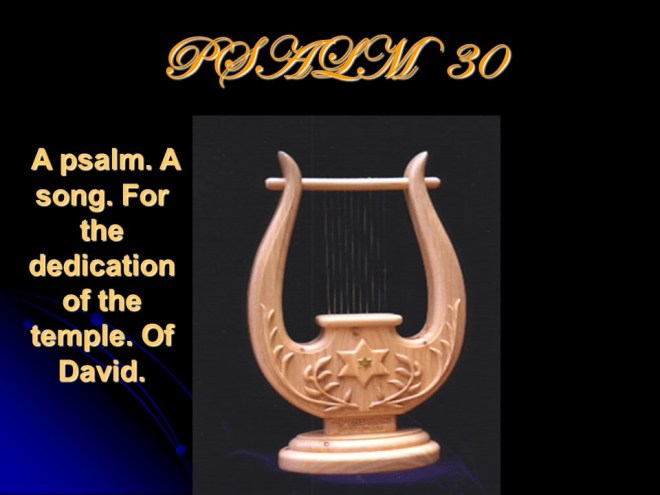 Psalm 30, for the dedication of the Temple. Of David. ( An alternate translation : For the dedication of the House of David.) Punctuations are important, but are not in the Hebrew text. You decide the best interpretation. It was written at the time of the completion of building David’s palace, but Charles Spurgeon, among others, thought that it was actually written prophetically for the dedication of the Temple – for which David made the preparations, but the construction of the Temple was left to Solomon to perform.