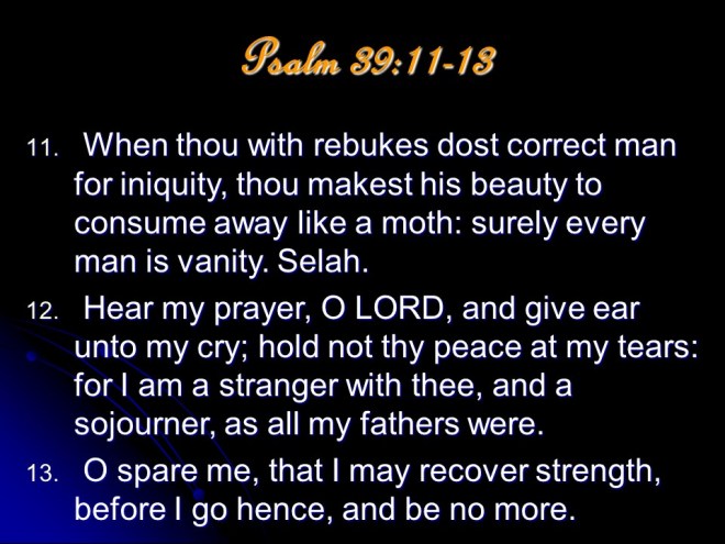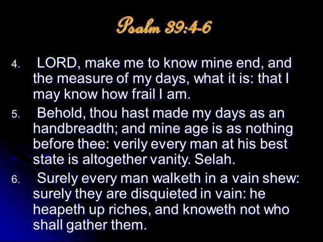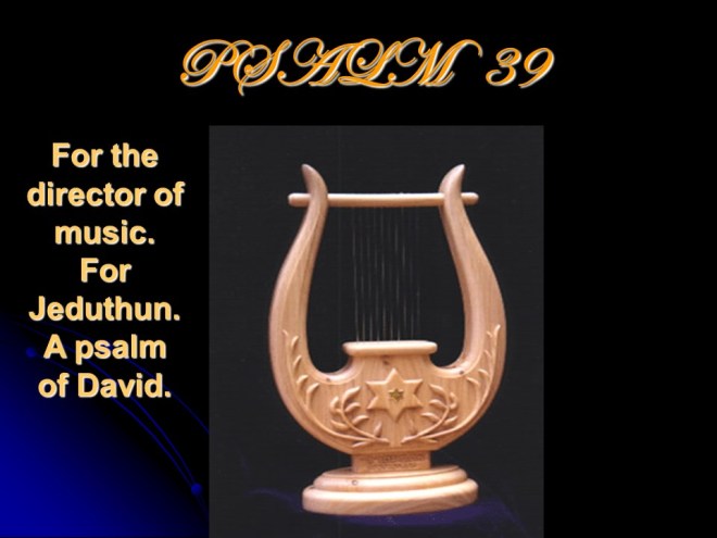 Psalm 39, of David. At the later part of his life David wrote this Psalm to give words of wisdom, knowing the end for him was near. It is sometimes quoted in part during funerals to give comfort when words are hard to find.