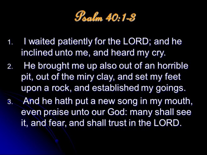 June 11: Psalm 40, Psalm 41, Psalm 42, 1 Chronicles 13, 1 Chronicles 14 (click on the chapter to begin reading)
