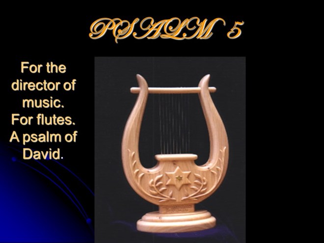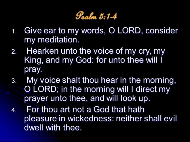 Psalm 5 is a prayer extolling the joy of praising God and praying towards Jerusalem, but is also an urgent prayer to do away with and destroy all wickedness and wicked people.