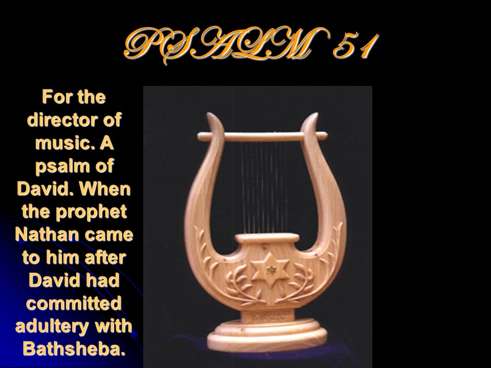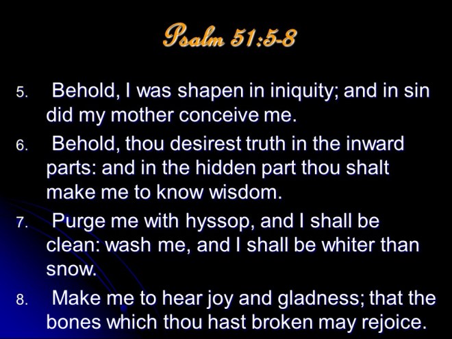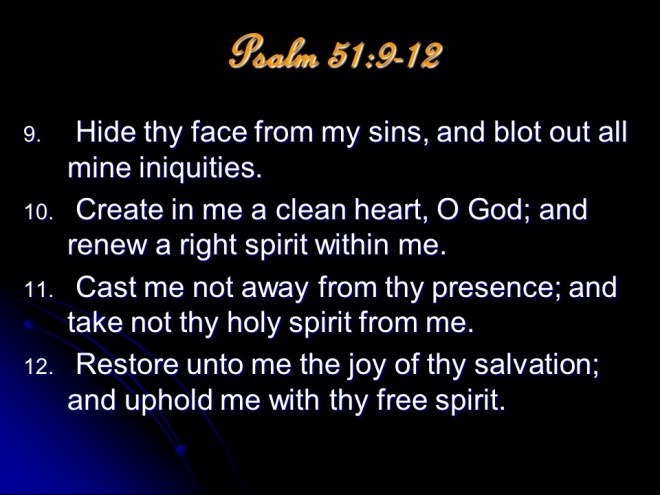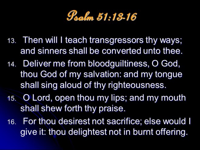 Psalm 51, of David, written after Nathan confronted David after his adultery with Bathsheba. This Psalm explains fully, how God would say, after David was pointed out to be both an adulterer and a murderer: “He was a man after God’s own heart”.