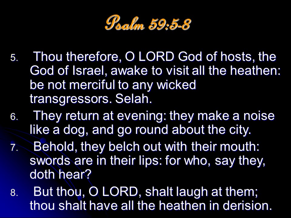 Psalm 59, of David. A prayer for deliverance from Saul and his men seeking to kill David. It ends up with David singing God’s praises.