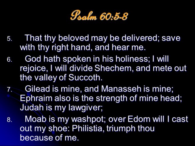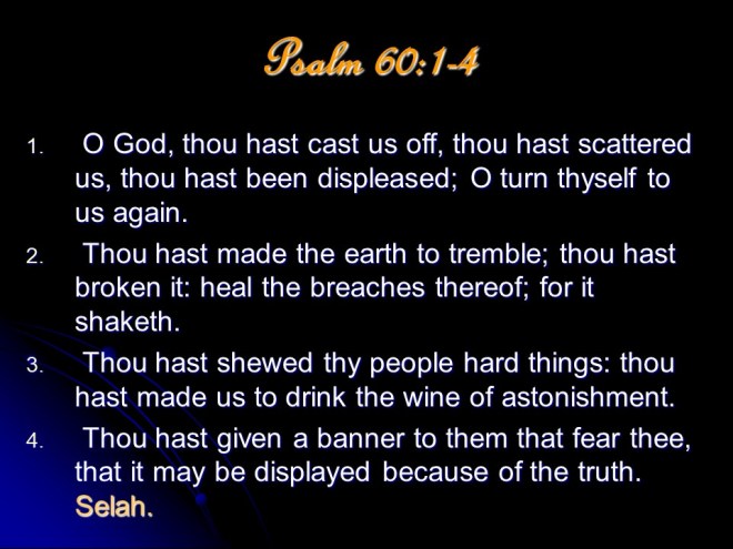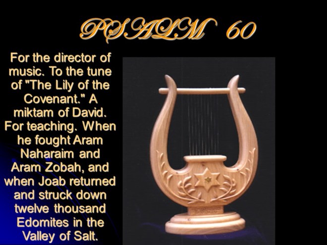 Psalm 60, of David. A Psalm intended for teaching. Even though they were defeated, David gave God the glory for future victories and deliverance.