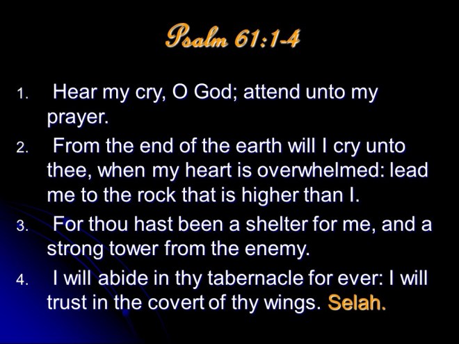 Psalm 61, of David. As so often happened, David was in trouble and cried out to God, proclaiming his trust in God, singing praises.